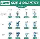 Sae & Metric Grease Fittings Kit, 220pcs Hydraulic Grease Zerk Assortment About this item All-in-One Kit: The grease fitting kit includes 12 most commonly used Types of SAE and metric grease accessories, which can supply lubricant to bearings and other mechanical equipment without disassembly; and the combo of right-angle, 90-degree and 45-degree angled joints solve the problem of OEM incompatibility. Efficiently Work: These 1/4", 1/8", M6 and M10 grease joints are perfect for automotive and industrial applications. The straight, 45° and 90° heads works for hard-to-reach places. Durable: The grease fittings are constructed from high-strength zinc-plated steel for extra strength and rust resistance, meet and exceeds ISO/TS16949 certified and 48 Hours corrosion resistance tested.It comes with stronger corrosion resistance and oxidation resistance. Easy to Organize: Transparent storage box, easy to store and carry. Keep the parts clean and orderly. Save Time: Inject lubricant into the bearing without disassembling parts for lubrication, thus saving time for car repairs. Shipping Fast Shipping Worldwide Returns We accept returns 30 days from the package received. Payments All payments are accepted via PayPal. Feedbacks The product came very well packaged. I'm very happy. thank you for everything. Seller strongly recommended. This is great! I recommend! The product looks amazing. Delivery was fast. Excellent seller, great communication. I advise everyone.