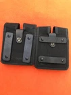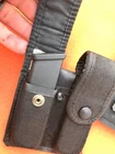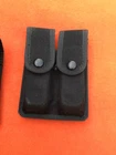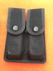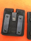 Safariland Tactical Nylon Double Magazine Pouch Glock 17 Size. This is a used pouch but solid and serviceable. The original plastic belt loop deteriorated and was replaced with heavy harness leather belt loops. The design and fitment of the loops allow them to be positioned for vertical or horizontal wear. They will fit on up to a 2.25" duty belt . It is recommended that after deciding on vertical or horizontal wear, the screws should be Loctited to prevent unscrewing.