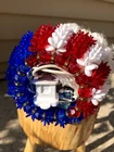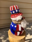 This is a nice piece of safety pin art, The theme is either Uncle Sam or Santa red, white, and blue. Measures 8 inches tall and 4 inches wide at the base. There is a plug with mini lights in the base. It can be plugged into an outlet for a glowing effect in the evening. Please see my rabbit safety pin art, as I can combine shipping. From a smoke free home. Thank you for looking and bidding!
