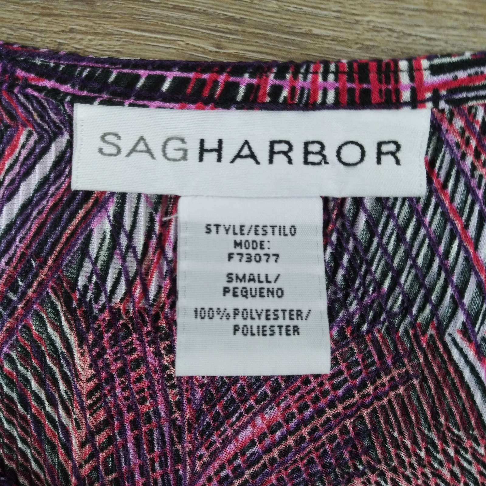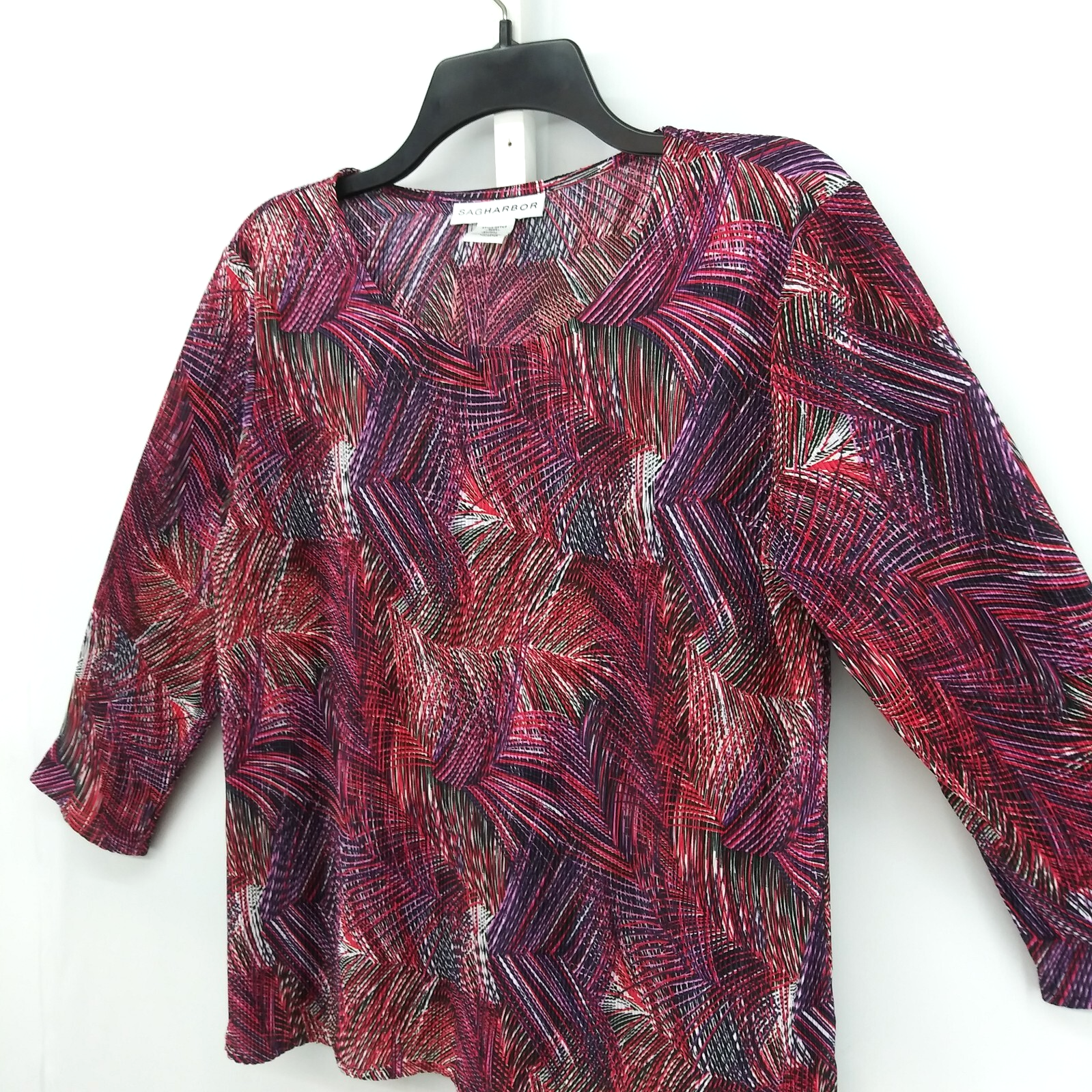 Neckline: Round Neck Closure: Pullover Features: Lightweight Type: Blouse Department: Women Personalize: No Sleeve Type: Casual Sleeve Occasion: Business, Casual, Party/Cocktail, Travel Season: Fall, Spring, Summer, Winter Size: S Size Type: Regular Garment Care: Hand Wash Only Sleeve Length: 3/4 Sleeve Brand: Sag Harbor Color: Red Fit: Regular Handmade: No Style: Basic Pattern: Geometric Seller Notes: “Pre-owned (see pictures)” Material: Polyester