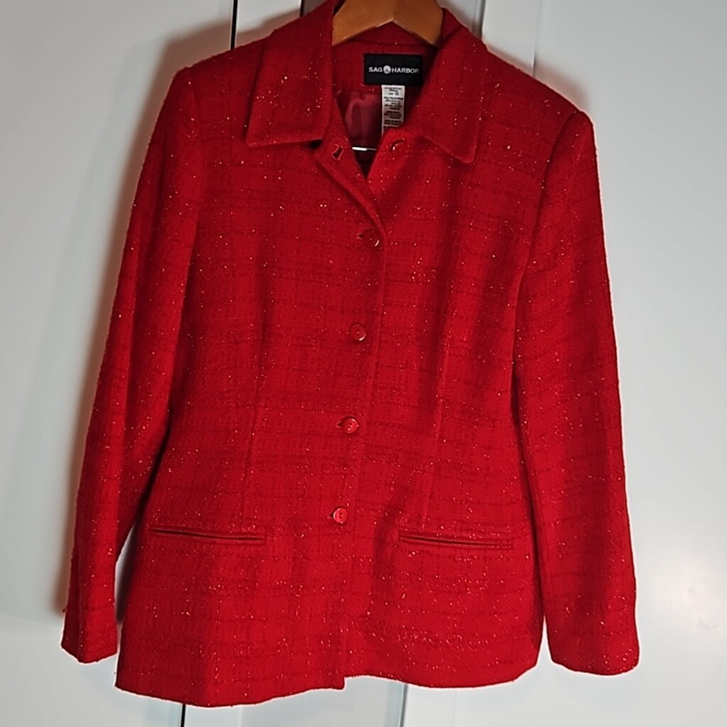 Beautiful red jacket/blazer by Sag Harbor. Gorgeous red color with sparkly threads, red buttons, Approximately measurements Pit to pit: 20" Length: 27" Pre-Owned in great condition