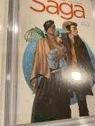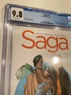 The product is a highly collectible first print CGC 9.8 graded Image Comics key first appearance of the series "Saga" by Fiona Staples and Brian K Vaughan. This comic book, published in 2012, features the characters Marko and Alana in the modern age era of US Comics. The certification from Certified Guaranty Company (CGC) adds value to this sought-after item for comic book enthusiasts and collectors alike.