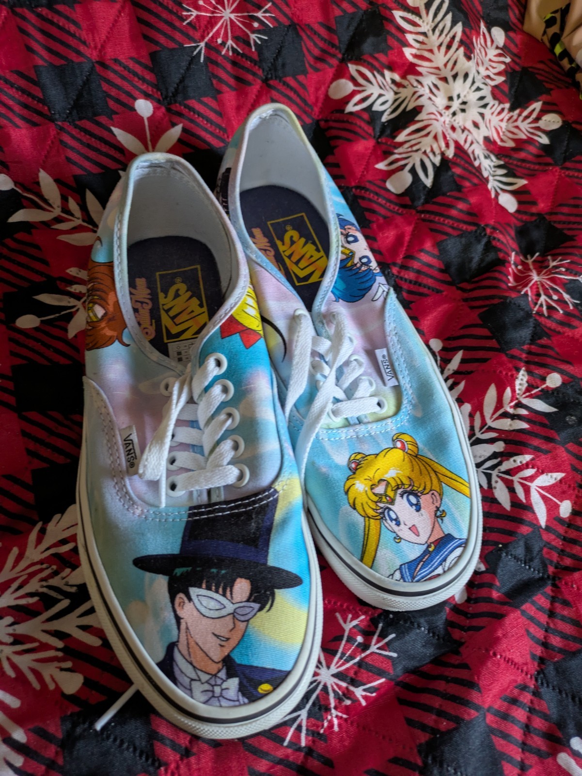 The Sailor Moon Vans Sneakers are a limited edition pair of canvas sneakers featuring a patchwork design with a lace-up closure. The shoes are signed by the brand Vans and are designed specifically for women. They are suitable for casual occasions and have a rubber outsole for added durability. The sneakers are adorned with the iconic Moon logo and are perfect for skateboarding and other athletic activities. With a standard shoe width and a foam insole, these sneakers provide both style and comfort for all-day wear.