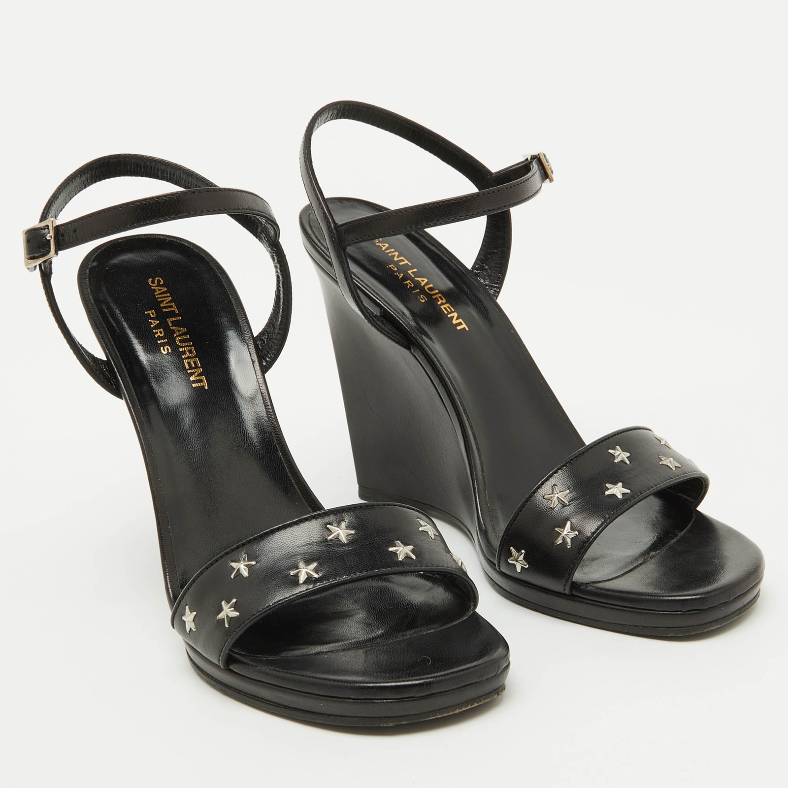 The sandals to invest in this season are these. Meticulously crafted, these exquisite heels combine luxury and comfort, creating a statement pair thats both fashionable and fabulous for every occasion.Certified by The Luxury Closet - This item has gone through a detailed authentication process overseen by our experts. We offer a lifetime guarantee of authenticity on all our items. Import duties, taxes and charges are not included in the item price. These charges are the buyers responsibility. Please check with your country’s customs office to determine what these additional cost will be prior to buying. Our eBay Store About Us Contact Us Add to Favorite Sellers Saint Laurent Black Stars Leather Ankle Strap Wedge Sandals Size 39.5 $220 The sandals to invest in this season are these. Meticulously crafted, these exquisite heels combine luxury and comfort, creating a statement pair thats both fashionable and fabulous for every occasion. Product Details Brand Color Black Dimensions Material Leather Size 39.5 Outsole Width 7.5 cm Outsole Length 20.5 cm Heel Height 11 cm Includes Original Dustbag, Original Box Certified by The Luxury Closet This item has gone through a detailed authentication process overseen by our experts. We offer a lifetime guarantee of authenticity on all our items. How We Check The in-house team of experts at The Luxury Closet is highly trained to verify the authenticity and the condition of the luxury products. They ensure that only 100% authentic items are put on sale.The evaluation process is unique with its own mix of assessment criteria and differs according to the category. Each item is evaluated based on the following combination of hallmarks, hardware, stitching, symmetry, material, craftsmanship, stamping, codes, hologram stickers, and packaging. Our authenticators also check if the items have been modified or amended (e.g., aftermarket diamonds, replaced batteries, repaired bags, etc.) International Buyers Import duties, taxes and charges are not included in the item price. These charges are the buyers responsibility. Please check with your country’s customs office to determine what these additional cost will be prior to buying.
