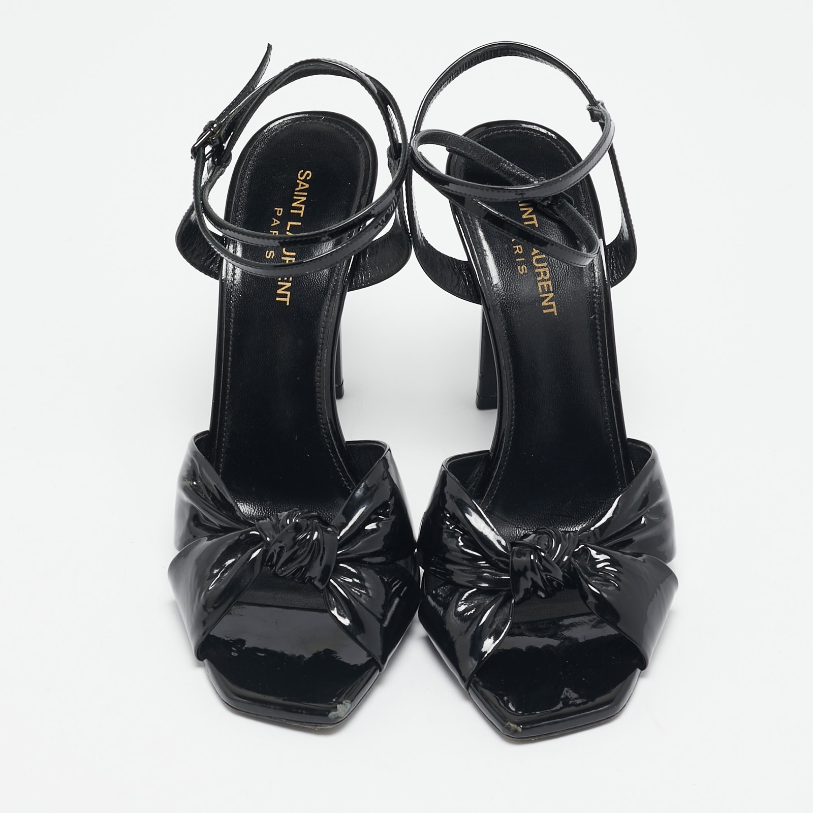 Refined with a hint of retro glam, these Saint Laurent Amy sandals feature high shine black patent leather and a knotted front detail. Anchored by a bold ankle strap, they’re a statement making finish to cocktail dresses or tailored jumpsuits.Certified by The Luxury Closet - This item has gone through a detailed authentication process overseen by our experts. We offer a lifetime guarantee of authenticity on all our items. Import duties, taxes and charges are not included in the item price. These charges are the buyers responsibility. Please check with your country’s customs office to determine what these additional cost will be prior to buying. Our eBay Store About Us Contact Us Add to Favorite Sellers Saint Laurent Black Patent Leather Amy Knot Ankle Strap Sandals Size 40.5 $306.9 Refined with a hint of retro glam, these Saint Laurent Amy sandals feature high shine black patent leather and a knotted front detail. Anchored by a bold ankle strap, they’re a statement making finish to cocktail dresses or tailored jumpsuits. Product Details Brand Color Black Dimensions Material Patent Leather Size 40.5 Outsole Width Outsole Length Heel Height Includes Certified by The Luxury Closet This item has gone through a detailed authentication process overseen by our experts. We offer a lifetime guarantee of authenticity on all our items. How We Check The in-house team of experts at The Luxury Closet is highly trained to verify the authenticity and the condition of the luxury products. They ensure that only 100% authentic items are put on sale.The evaluation process is unique with its own mix of assessment criteria and differs according to the category. Each item is evaluated based on the following combination of hallmarks, hardware, stitching, symmetry, material, craftsmanship, stamping, codes, hologram stickers, and packaging. Our authenticators also check if the items have been modified or amended (e.g., aftermarket diamonds, replaced batteries, repaired bags, etc.) International Buyers Import duties, taxes and charges are not included in the item price. These charges are the buyers responsibility. Please check with your country’s customs office to determine what these additional cost will be prior to buying.