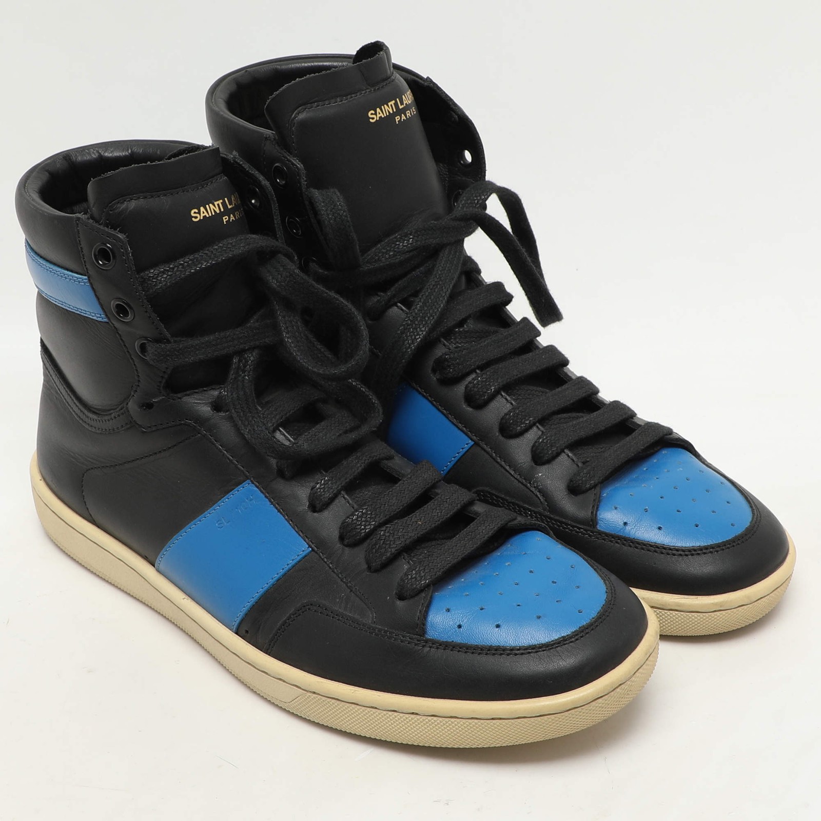Our eBay Store About Us Contact Us Add to Favorite Sellers Saint Laurent BlackBlue Leather SL10H High Top Sneakers Size 41 Bringing both ease and fashion in full are these Saint Laurent sneakers. They are designed using only the best materials for high durability. Wear them on long days for a luxe style without compromising comfort. Product Details Brand Saint Laurent Paris Color Black Includes Original Dustbag Outsole Length 28.5 cm Outsole Width 10 cm Size EU 41 (US 8/UK 7) Certified by The Luxury Closet This item has gone through a detailed authentication process overseen by our experts. We offer a lifetime guarantee of authenticity on all our items. How We Check The in-house team of experts at The Luxury Closet is highly trained to verify the authenticity and the condition of the luxury products. They ensure that only 100% authentic items are put on sale.The evaluation process is unique with its own mix of assessment criteria and differs according to the category. Each item is evaluated based on the following combination of hallmarks, hardware, stitching, symmetry, material, craftsmanship, stamping, codes, hologram stickers, and packaging. Our authenticators also check if the items have been modified or amended (e.g., aftermarket diamonds, replaced batteries, repaired bags, etc.) International Buyers Import duties, taxes and charges are not included in the item price. These charges are the buyers responsibility. Please check with your country’s customs office to determine what these additional cost will be prior to buying.