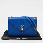 Elevate your outfits with this Monogram Envelope bag by Saint Laurent. It is crafted in Matelassé leather and features the YSL logo in gold tone metal on the front flap. The stunning creation is held by a handle.Certified by The Luxury Closet - This item has gone through a detailed authentication process overseen by our experts. We offer a lifetime guarantee of authenticity on all our items. Import duties, taxes and charges are not included in the item price. These charges are the buyers responsibility. Please check with your country’s customs office to determine what these additional cost will be prior to buying. Our eBay Store About Us Contact Us Add to Favorite Sellers Saint Laurent Blue Matelassé Leather Large Monogram Envelope Shoulder Bag $1785.3 Elevate your outfits with this Monogram Envelope bag by Saint Laurent. It is crafted in Matelassé leather and features the YSL logo in gold tone metal on the front flap. The stunning creation is held by a handle. Product Details Brand Color Blue Dimensions Material Leather Size Large Outsole Width Outsole Length Heel Height Includes Certified by The Luxury Closet This item has gone through a detailed authentication process overseen by our experts. We offer a lifetime guarantee of authenticity on all our items. How We Check The in-house team of experts at The Luxury Closet is highly trained to verify the authenticity and the condition of the luxury products. They ensure that only 100% authentic items are put on sale.The evaluation process is unique with its own mix of assessment criteria and differs according to the category. Each item is evaluated based on the following combination of hallmarks, hardware, stitching, symmetry, material, craftsmanship, stamping, codes, hologram stickers, and packaging. Our authenticators also check if the items have been modified or amended (e.g., aftermarket diamonds, replaced batteries, repaired bags, etc.) International Buyers Import duties, taxes and charges are not included in the item price. These charges are the buyers responsibility. Please check with your country’s customs office to determine what these additional cost will be prior to buying.