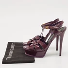 These sandals will frame your feet in an elegant manner. Crafted from quality materials, they flaunt a classy display, comfortable insoles and durable heels.Certified by The Luxury Closet - This item has gone through a detailed authentication process overseen by our experts. We offer a lifetime guarantee of authenticity on all our items. Import duties, taxes and charges are not included in the item price. These charges are the buyers responsibility. Please check with your country’s customs office to determine what these additional cost will be prior to buying. Our eBay Store About Us Contact Us Add to Favorite Sellers Saint Laurent Dark Purple Patent Leather Tribute Platform Sandals Size 38 $268.4 These sandals will frame your feet in an elegant manner. Crafted from quality materials, they flaunt a classy display, comfortable insoles and durable heels. Product Details Brand Color Purple Dimensions Material Patent Leather Size 38 Outsole Width Outsole Length Heel Height Includes Certified by The Luxury Closet This item has gone through a detailed authentication process overseen by our experts. We offer a lifetime guarantee of authenticity on all our items. How We Check The in-house team of experts at The Luxury Closet is highly trained to verify the authenticity and the condition of the luxury products. They ensure that only 100% authentic items are put on sale.The evaluation process is unique with its own mix of assessment criteria and differs according to the category. Each item is evaluated based on the following combination of hallmarks, hardware, stitching, symmetry, material, craftsmanship, stamping, codes, hologram stickers, and packaging. Our authenticators also check if the items have been modified or amended (e.g., aftermarket diamonds, replaced batteries, repaired bags, etc.) International Buyers Import duties, taxes and charges are not included in the item price. These charges are the buyers responsibility. Please check with your country’s customs office to determine what these additional cost will be prior to buying.