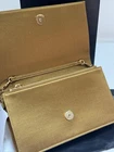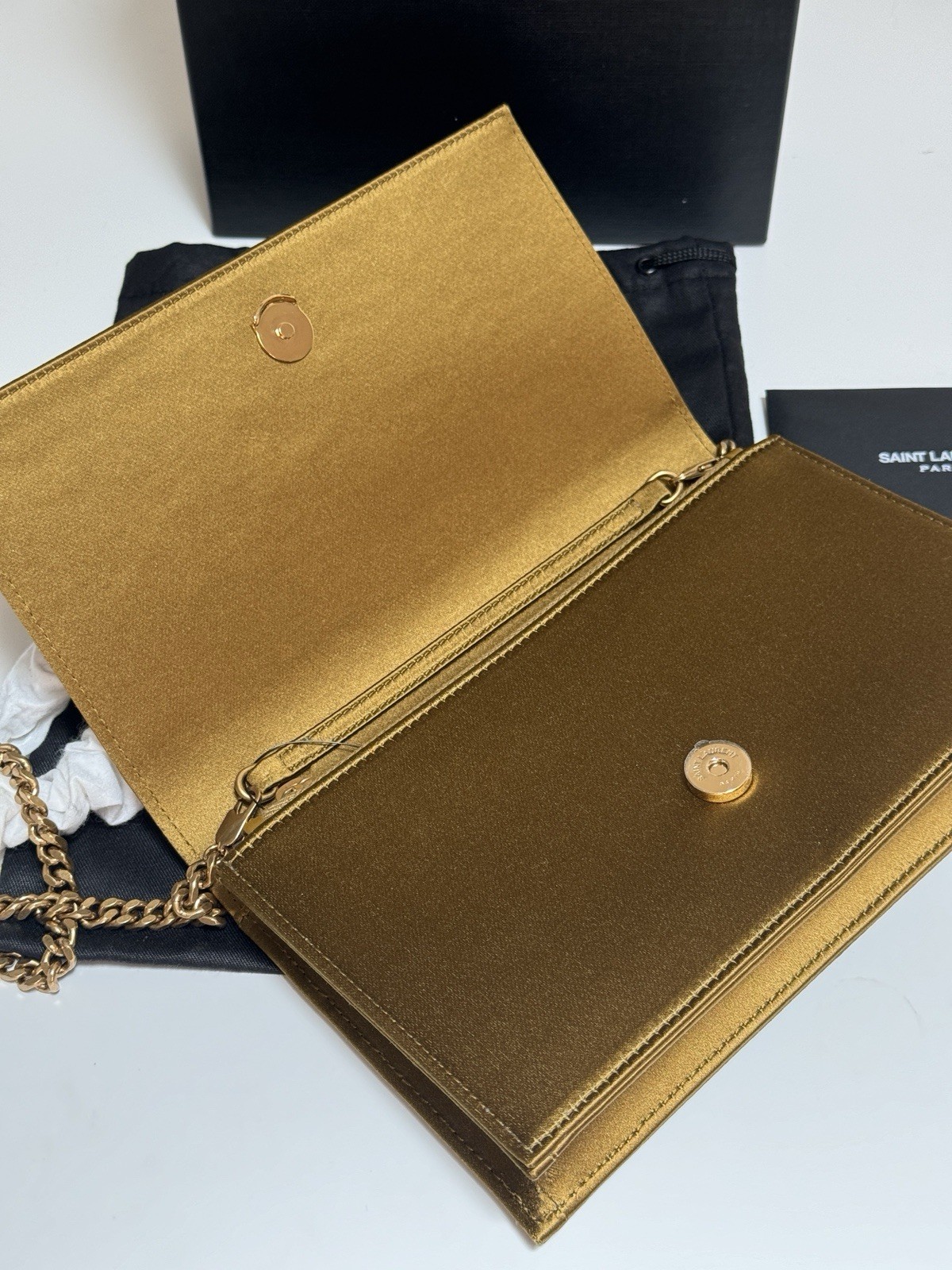 The Saint Laurent Kate Tassel Satin Wallet on Chain is a stylish crossbody handbag designed for casual occasions. Made from luxurious satin material in a beautiful green color, this rectangular shaped bag features a snap closure and gold hardware accents. The gold crossbody strap adds a touch of elegance to the overall look, making it a versatile accessory for any outfit. Complete with original dust bag and box, this Saint Laurent Kate wallet on chain is a chic and fashionable choice for women looking for a high-end designer handbag. New bag, tags attached. Box and dust bag.