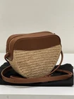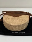 The Saint Laurent Raffia Calfskin Le Monogramme Coeur Shoulder Bag is a stylish and versatile accessory for women. Made with raffia exterior, this bag features a brown leather shoulder strap and gold hardware accents. With a zip closure and a beige lining, this handbag is perfect for travel and casual occasions. The iconic Saint Laurent monogram adds a touch of luxury to this chic shoulder bag, making it a must-have fashion statement. Complete with an original dust bag, this bag is a timeless addition to any wardrobe. The bag is new, but has minor scratches on the leather from handling during photography and storage. Dust bag included.