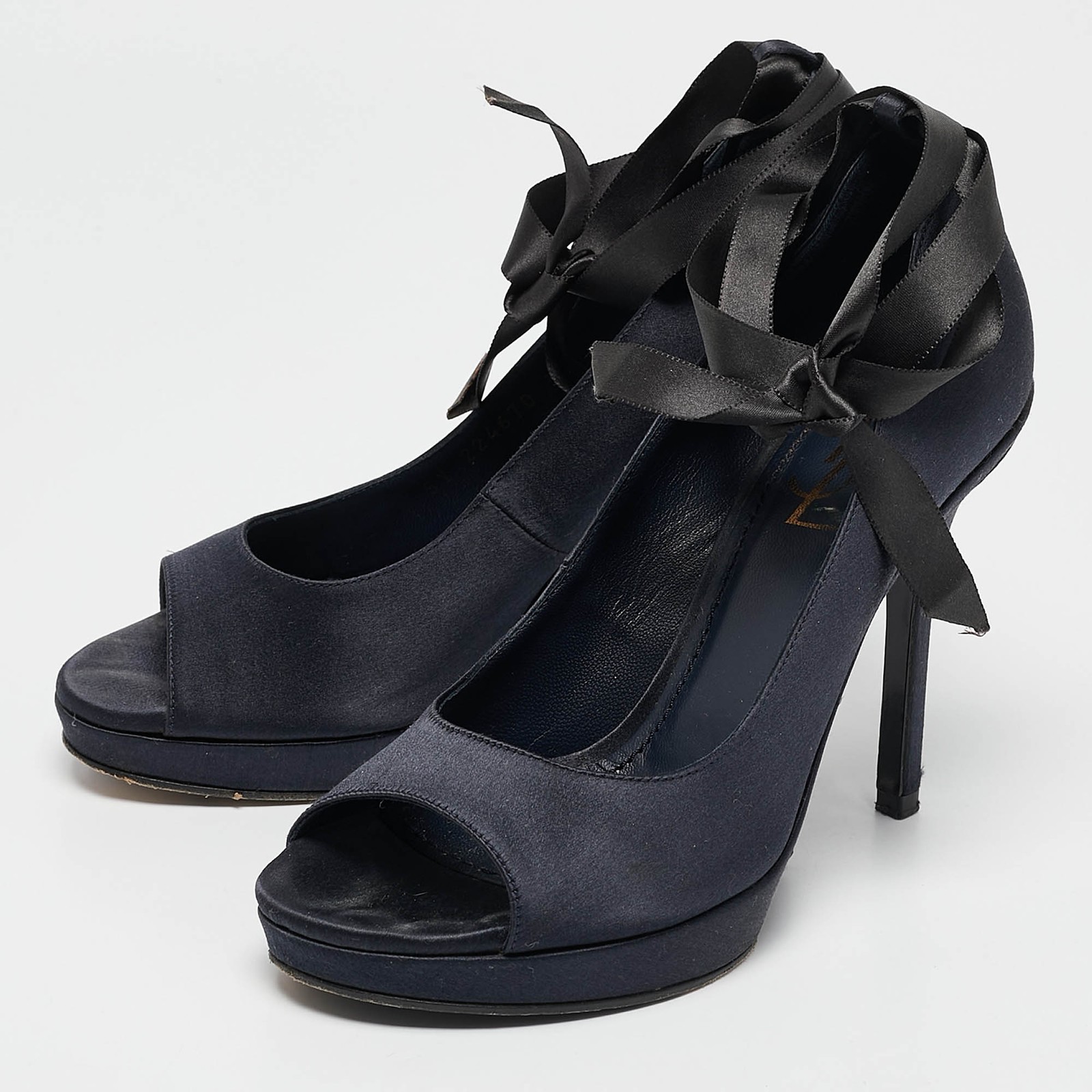 Curvaceous arches, a feminine appeal, and a well built structure define this set of Saint Laurent pumps. Coming with comfortable insoles and sleek heels, style them with your favorite outfits.Certified by The Luxury Closet - This item has gone through a detailed authentication process overseen by our experts. We offer a lifetime guarantee of authenticity on all our items. Import duties, taxes and charges are not included in the item price. These charges are the buyers responsibility. Please check with your country’s customs office to determine what these additional cost will be prior to buying. Our eBay Store About Us Contact Us Add to Favorite Sellers Saint Laurent Navy Blue Satin Open Toe Ankle Wrap Platform Pumps Size 37 $201.3 Curvaceous arches, a feminine appeal, and a well built structure define this set of Saint Laurent pumps. Coming with comfortable insoles and sleek heels, style them with your favorite outfits. Product Details Brand Color Navy Blue Dimensions Material Satin Size 37 Outsole Width 7 cm Outsole Length 23 cm Heel Height 11 cm Includes The Luxury Closet Packaging Certified by The Luxury Closet This item has gone through a detailed authentication process overseen by our experts. We offer a lifetime guarantee of authenticity on all our items. How We Check The in-house team of experts at The Luxury Closet is highly trained to verify the authenticity and the condition of the luxury products. They ensure that only 100% authentic items are put on sale.The evaluation process is unique with its own mix of assessment criteria and differs according to the category. Each item is evaluated based on the following combination of hallmarks, hardware, stitching, symmetry, material, craftsmanship, stamping, codes, hologram stickers, and packaging. Our authenticators also check if the items have been modified or amended (e.g., aftermarket diamonds, replaced batteries, repaired bags, etc.) International Buyers Import duties, taxes and charges are not included in the item price. These charges are the buyers responsibility. Please check with your country’s customs office to determine what these additional cost will be prior to buying.