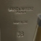 These sandals will frame your feet in an elegant manner. Crafted from quality materials, they flaunt a classy display, comfortable insoles and durable heels.Certified by The Luxury Closet - This item has gone through a detailed authentication process overseen by our experts. We offer a lifetime guarantee of authenticity on all our items. Import duties, taxes and charges are not included in the item price. These charges are the buyers responsibility. Please check with your country’s customs office to determine what these additional cost will be prior to buying. Our eBay Store About Us Contact Us Add to Favorite Sellers Saint Laurent Olive Green Patent Leather Tribute Platform Sandals Size 38 $250.8 These sandals will frame your feet in an elegant manner. Crafted from quality materials, they flaunt a classy display, comfortable insoles and durable heels. Product Details Brand Color Green Dimensions Material Patent Leather Size 38 Outsole Width 7 cm Outsole Length 22 cm Heel Height 14 cm Includes The Luxury Closet Packaging Certified by The Luxury Closet This item has gone through a detailed authentication process overseen by our experts. We offer a lifetime guarantee of authenticity on all our items. How We Check The in-house team of experts at The Luxury Closet is highly trained to verify the authenticity and the condition of the luxury products. They ensure that only 100% authentic items are put on sale.The evaluation process is unique with its own mix of assessment criteria and differs according to the category. Each item is evaluated based on the following combination of hallmarks, hardware, stitching, symmetry, material, craftsmanship, stamping, codes, hologram stickers, and packaging. Our authenticators also check if the items have been modified or amended (e.g., aftermarket diamonds, replaced batteries, repaired bags, etc.) International Buyers Import duties, taxes and charges are not included in the item price. These charges are the buyers responsibility. Please check with your country’s customs office to determine what these additional cost will be prior to buying.