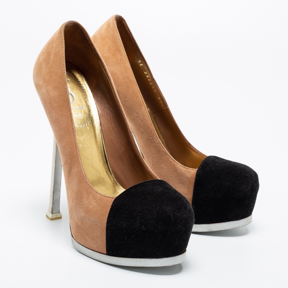 Fashionable and well made, these Tribtoo pumps from Saint Laurent Paris will add beauty and style to your closet. Crafted from suede, the pumps feature contrast cap toes, leather insoles, concealed platforms, and 14.5 cm heels.Certified by The Luxury Closet - This item has gone through a detailed authentication process overseen by our experts. We offer a lifetime guarantee of authenticity on all our items. Import duties, taxes and charges are not included in the item price. These charges are the buyers responsibility. Please check with your country’s customs office to determine what these additional cost will be prior to buying. Our eBay Store About Us Contact Us Add to Favorite Sellers Saint Laurent Paris Tow Tone Suede Tribtoo Platform Pumps Size 37.5 $177.1 Fashionable and well made, these Tribtoo pumps from Saint Laurent Paris will add beauty and style to your closet. Crafted from suede, the pumps feature contrast cap toes, leather insoles, concealed platforms, and 14.5 cm heels. Product Details Brand Color Beige Dimensions Material Suede Size 37.5 Outsole Width 7.5 CM Outsole Length 21 CM Heel Height 14.5 CM Includes The Luxury Closet Packaging Certified by The Luxury Closet This item has gone through a detailed authentication process overseen by our experts. We offer a lifetime guarantee of authenticity on all our items. How We Check The in-house team of experts at The Luxury Closet is highly trained to verify the authenticity and the condition of the luxury products. They ensure that only 100% authentic items are put on sale.The evaluation process is unique with its own mix of assessment criteria and differs according to the category. Each item is evaluated based on the following combination of hallmarks, hardware, stitching, symmetry, material, craftsmanship, stamping, codes, hologram stickers, and packaging. Our authenticators also check if the items have been modified or amended (e.g., aftermarket diamonds, replaced batteries, repaired bags, etc.) International Buyers Import duties, taxes and charges are not included in the item price. These charges are the buyers responsibility. Please check with your country’s customs office to determine what these additional cost will be prior to buying.