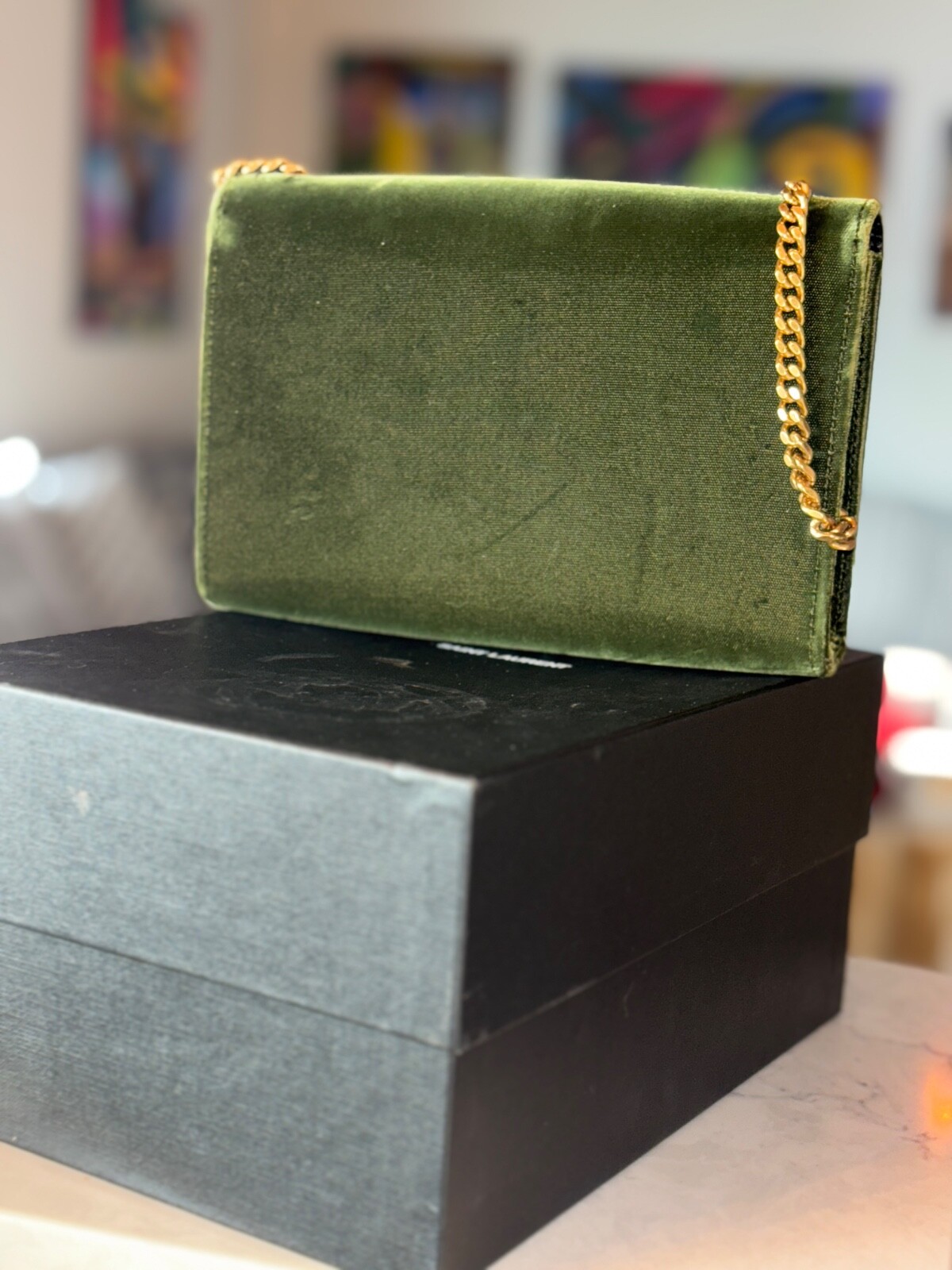 PRE-OWNED-AUTHENTIC-GOOD CONDITION-SAINT LAURENT SHOULDER BAG Bought In a Department Store in Dublin Ireland, Paid $2500 For It From 2015 Collection Green Suede Made in Italy Gold-Tone Hardware Chain-Link Shoulder Strap Tassel & Chain-Link Accents Leather Lining & Single Interior Pocket Snap/Magnetic Front Closure