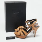 One of the most celebrated designs from Saint Laurent is their Tribute sandals. They are preferred by the fashion elite worldwide because of their practicality, and this black creation is no different. Created from leather, the pair flaunts an intertwined strappy vamp, ankle buckle closure, and gold tone hardware. The 11cm heels and platforms of this pair will take your fashion sense to new heights.Certified by The Luxury Closet - This item has gone through a detailed authentication process overseen by our experts. We offer a lifetime guarantee of authenticity on all our items. Import duties, taxes and charges are not included in the item price. These charges are the buyers responsibility. Please check with your country’s customs office to determine what these additional cost will be prior to buying. Our eBay Store About Us Contact Us Add to Favorite Sellers Saint Laurent Tan Leather Tribute Sandals Size 39.5 $268.4 One of the most celebrated designs from Saint Laurent is their Tribute sandals. They are preferred by the fashion elite worldwide because of their practicality, and this black creation is no different. Created from leather, the pair flaunts an intertwined strappy vamp, ankle buckle closure, and gold tone hardware. The 11cm heels and platforms of this pair will take your fashion sense to new heights. Product Details Brand Color Tan Dimensions Material Leather Size 39.5 Outsole Width 7 cm Outsole Length 24 cm Heel Height 11 cm Includes Original Box, Info Booklet Certified by The Luxury Closet This item has gone through a detailed authentication process overseen by our experts. We offer a lifetime guarantee of authenticity on all our items. How We Check The in-house team of experts at The Luxury Closet is highly trained to verify the authenticity and the condition of the luxury products. They ensure that only 100% authentic items are put on sale.The evaluation process is unique with its own mix of assessment criteria and differs according to the category. Each item is evaluated based on the following combination of hallmarks, hardware, stitching, symmetry, material, craftsmanship, stamping, codes, hologram stickers, and packaging. Our authenticators also check if the items have been modified or amended (e.g., aftermarket diamonds, replaced batteries, repaired bags, etc.) International Buyers Import duties, taxes and charges are not included in the item price. These charges are the buyers responsibility. Please check with your country’s customs office to determine what these additional cost will be prior to buying.