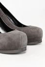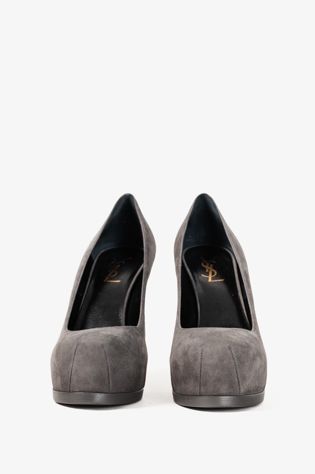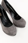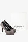 These Saint Laurent Tribute Grey Suede Platform Pumps are skillfuly crafted, showcasing a timeless design with contemporary enhancements. The hidden platform, seamed sculpted toe, and square-shaped wrapped stiletto heel delivers the Saint Laurent signature silhouette. Size: 39 (US 8.5) Condition: pristine; new in box; includes dustbag, extra heel caps, and box Approximate Measurements: Insole length: 10" (25 cm) Heel height: 4.5" (11 cm) Platform height: 1" (3 cm) Composition: suede, leather