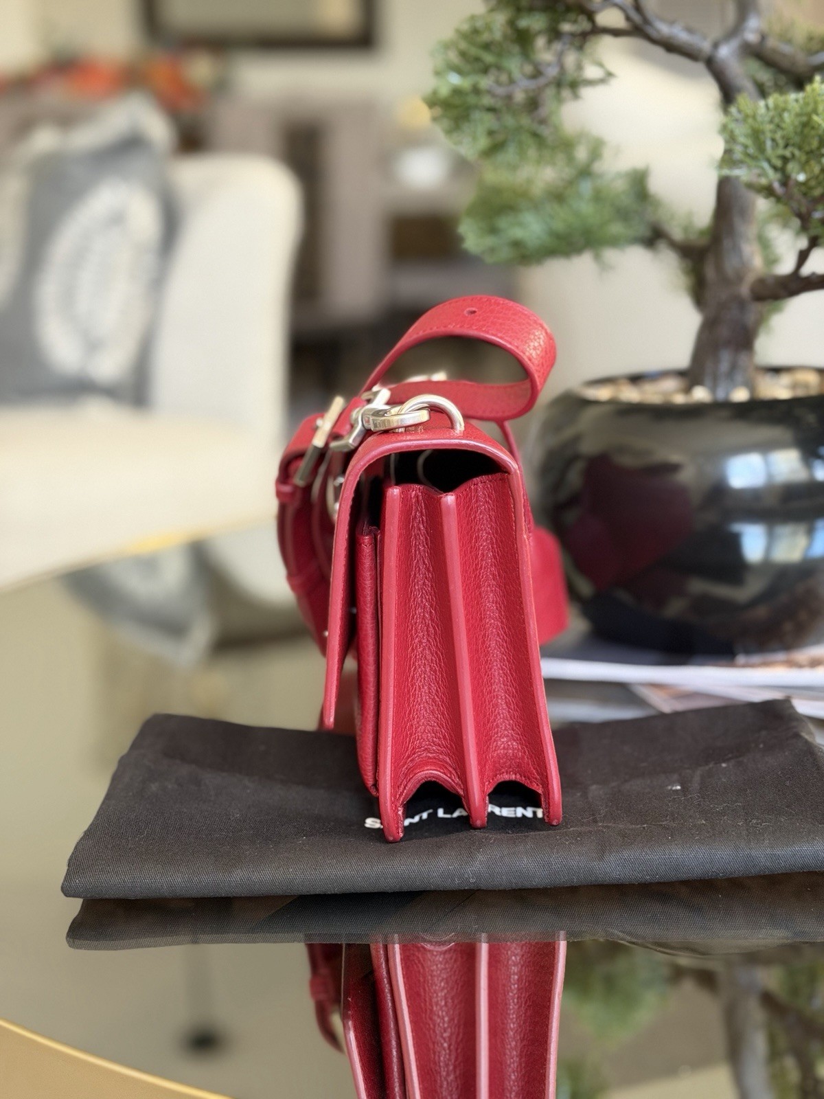 The Saint Laurent Flap Crossbody Bag in red calfskin leather is a stylish and compact accessory perfect for women on the go. With a solid rectangular shape and a magnetic closure, this small-sized bag is both practical and fashionable. The gold hardware adds a touch of elegance, while the black leather lining provides a classic finishing touch. The adjustable strap drop of 10-19 inches allows for versatility in carrying this chic piece from the Saint Laurent Classic Monogram collection. Ideal for adding a pop of color to any outfit, this crossbody bag is a must-have for fashion-forward individuals. This bag is beautiful and like new condition, red with silver hardware and I’m adding a dust bag for you ♥️