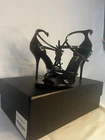 Brand New In Box Saint Laurent Cassandra Black Leather YSL Logo Strappy Sandal Heel Pump EU 38 US 8. Retail Price $1350. Purchased from Neiman Marcus. Beautiful pair of shoes.