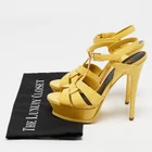 A vibrant take on a house icon, these Saint Laurent Tribute sandals in yellow patent leather feature intertwining straps, a towering platform, and a sky high heel for a statement finish.Certified by The Luxury Closet - This item has gone through a detailed authentication process overseen by our experts. We offer a lifetime guarantee of authenticity on all our items. Import duties, taxes and charges are not included in the item price. These charges are the buyers responsibility. Please check with your country’s customs office to determine what these additional cost will be prior to buying. Our eBay Store About Us Contact Us Add to Favorite Sellers Saint Laurent Yellow Patent Leather Tribute Platform Sandals Size 35 $139.7 A vibrant take on a house icon, these Saint Laurent Tribute sandals in yellow patent leather feature intertwining straps, a towering platform, and a sky high heel for a statement finish. Product Details Brand Color Yellow Dimensions Material Patent Leather Size 35 Outsole Width 6.5 cm Outsole Length 21 cm Heel Height 13 cm Includes The Luxury Closet Packaging Certified by The Luxury Closet This item has gone through a detailed authentication process overseen by our experts. We offer a lifetime guarantee of authenticity on all our items. How We Check The in-house team of experts at The Luxury Closet is highly trained to verify the authenticity and the condition of the luxury products. They ensure that only 100% authentic items are put on sale.The evaluation process is unique with its own mix of assessment criteria and differs according to the category. Each item is evaluated based on the following combination of hallmarks, hardware, stitching, symmetry, material, craftsmanship, stamping, codes, hologram stickers, and packaging. Our authenticators also check if the items have been modified or amended (e.g., aftermarket diamonds, replaced batteries, repaired bags, etc.) International Buyers Import duties, taxes and charges are not included in the item price. These charges are the buyers responsibility. Please check with your country’s customs office to determine what these additional cost will be prior to buying.