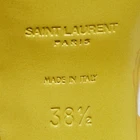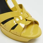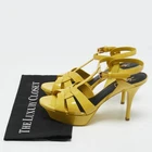 A cult classic in a bright yellow hue, these glossy Tribute sandals bring height, attitude, and an instant hit of Saint Laurent glamour.Certified by The Luxury Closet - This item has gone through a detailed authentication process overseen by our experts. We offer a lifetime guarantee of authenticity on all our items. Import duties, taxes and charges are not included in the item price. These charges are the buyers responsibility. Please check with your country’s customs office to determine what these additional cost will be prior to buying. Our eBay Store About Us Contact Us Add to Favorite Sellers Saint Laurent Yellow Patent Leather Tribute Platform Sandals Size 38.5 $467.5 A cult classic in a bright yellow hue, these glossy Tribute sandals bring height, attitude, and an instant hit of Saint Laurent glamour. Product Details Brand Color Yellow Dimensions Material Patent Leather Size 38.5 Outsole Width Outsole Length Heel Height Includes Certified by The Luxury Closet This item has gone through a detailed authentication process overseen by our experts. We offer a lifetime guarantee of authenticity on all our items. How We Check The in-house team of experts at The Luxury Closet is highly trained to verify the authenticity and the condition of the luxury products. They ensure that only 100% authentic items are put on sale.The evaluation process is unique with its own mix of assessment criteria and differs according to the category. Each item is evaluated based on the following combination of hallmarks, hardware, stitching, symmetry, material, craftsmanship, stamping, codes, hologram stickers, and packaging. Our authenticators also check if the items have been modified or amended (e.g., aftermarket diamonds, replaced batteries, repaired bags, etc.) International Buyers Import duties, taxes and charges are not included in the item price. These charges are the buyers responsibility. Please check with your country’s customs office to determine what these additional cost will be prior to buying.