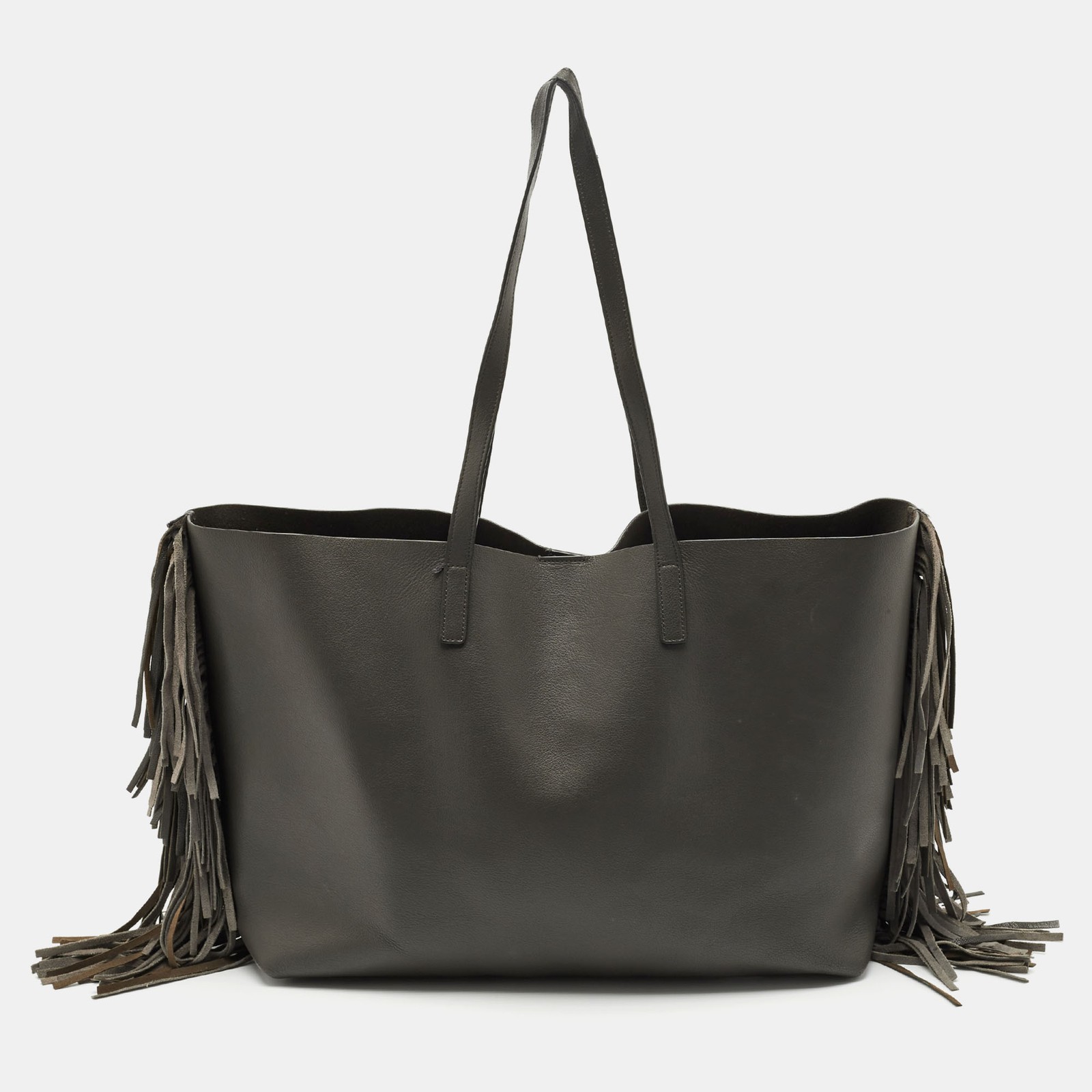 Ensure your days essentials are in order and your outfit is complete with this Saint Laurent tote. Crafted using the best materials, the bag carries the maisons signature of artful craftsmanship and enduring appeal.Certified by The Luxury Closet - This item has gone through a detailed authentication process overseen by our experts. We offer a lifetime guarantee of authenticity on all our items. Import duties, taxes and charges are not included in the item price. These charges are the buyers responsibility. Please check with your country’s customs office to determine what these additional cost will be prior to buying. Our eBay Store About Us Contact Us Add to Favorite Sellers Saint Laurent Grey Leather Fringe E/W Shopping Tote $594 Ensure your days essentials are in order and your outfit is complete with this Saint Laurent tote. Crafted using the best materials, the bag carries the maisons signature of artful craftsmanship and enduring appeal. Product Details Brand Color Grey Dimensions Material Leather Size Outsole Width Outsole Length Heel Height Includes Certified by The Luxury Closet This item has gone through a detailed authentication process overseen by our experts. We offer a lifetime guarantee of authenticity on all our items. How We Check The in-house team of experts at The Luxury Closet is highly trained to verify the authenticity and the condition of the luxury products. They ensure that only 100% authentic items are put on sale.The evaluation process is unique with its own mix of assessment criteria and differs according to the category. Each item is evaluated based on the following combination of hallmarks, hardware, stitching, symmetry, material, craftsmanship, stamping, codes, hologram stickers, and packaging. Our authenticators also check if the items have been modified or amended (e.g., aftermarket diamonds, replaced batteries, repaired bags, etc.) International Buyers Import duties, taxes and charges are not included in the item price. These charges are the buyers responsibility. Please check with your country’s customs office to determine what these additional cost will be prior to buying.