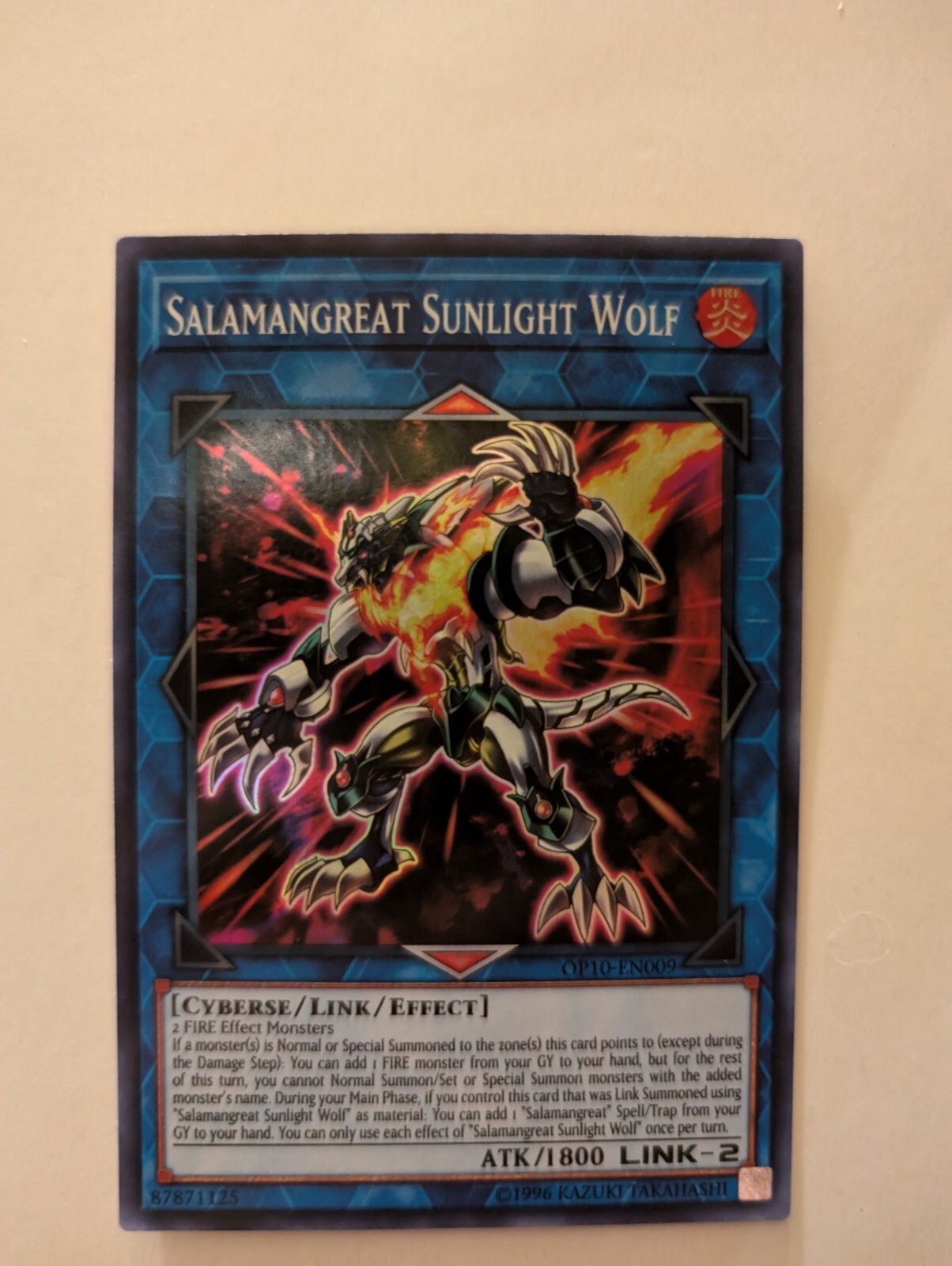 Salamangreat Sunlight Wolf - OP10-EN009 - Super Rare - Unlimited Edition Image is a stock photo of the card. You will receive the card in Heavily Played condition Condition: Heavily Played ATK/DEF : 1800/LINK-2 Attribute : Fire Card Number : OP10-EN009 Card Rules : Card Text : 2 FIRE Effect Monsters If a monster(s) is Normal or Special Summoned to the zone(s) this card points to (except during the Damage Step): You can add 1 FIRE monster from your GY to your hand, but for the rest of this turn, you cannot Normal Summon/Set or Special Summon monsters with the added monster's name. During your Main Phase, if you control this card that was Link Summoned using "Salamangreat Sunlight Wolf" as material: You can add 1 "Salamangreat" Spell/Trap from your GY to your hand. You can only use each effect of "Salamangreat Sunlight Wolf" once per turn. Card Type : Link/Effect Monster Edition : Unlimited Level : Monster Type : Cyberse Name : Salamangreat Sunlight Wolf Passcode : 87871125 Pendulum Scale : Rarity : Super Rare Set : OTS Tournament Pack 10 Be sure to visit our store for a wide selection of your favorite cards! We are running specials RIGHT NOW!! Shipping Options: ~Ships in a regular white envelope with a stamp for FREE! (THERE IS NO TRACKING INFORMATION AVAILABLE FOR THE ABOVE METHOD. SHIPPING TIME IS 4-10 BUSINESS DAYS) ~Ships in a TRACKEDbubble mailer for $5.99! ~Shipments are handled same or next business day. ~FREE SHIPPING for each additional card, so shop around our store!