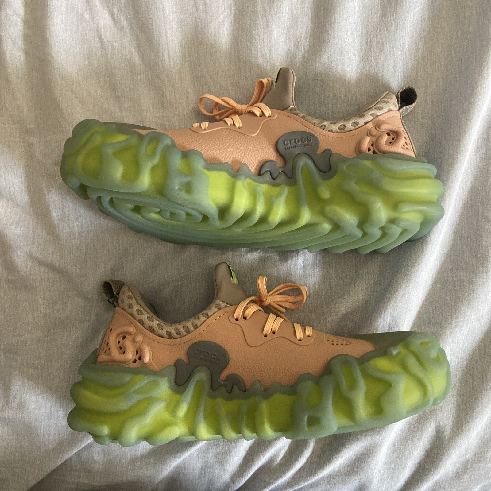The Crocs Juniper “Guava” by Salehe Bembury, originally launched on May 30, 2024. This is collaboration between Crocs and Salehe Bembury, an American footwear designer renowned for using contrasting textures and unconventional silhouettes. This is the first sneaker of its kind. Vibrate colors used on upper and sole of sneaker. A signature design detail of this sneaker is the sole, Salehe Bembury likes emphasizing his fingerprint. This is not a Classic Crocs silhouette, this sneaker has a front lace closure and perforations across the vamp and heel.