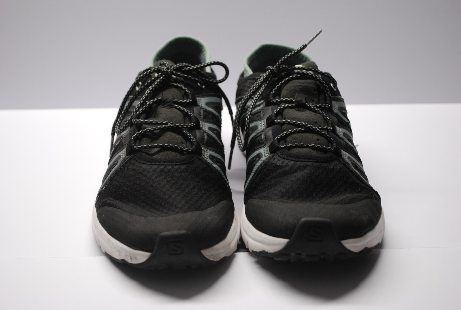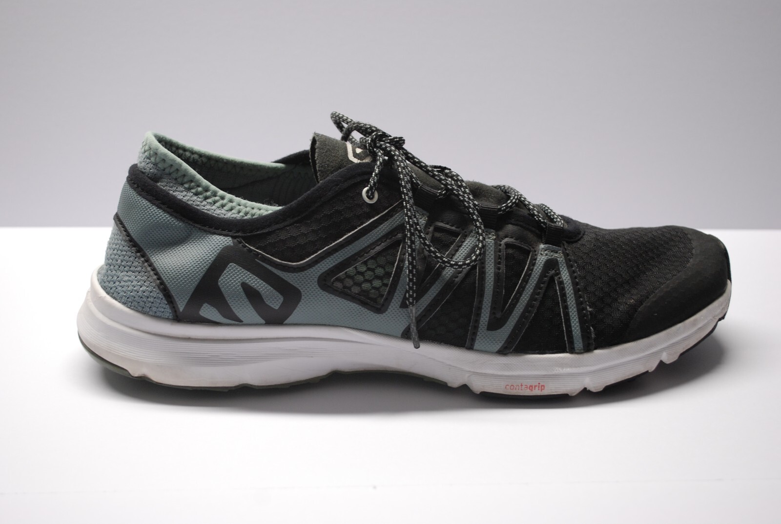 The Salomon Crossamphibian Swift Shoes are men's athletic sneakers in black with gray accents. They are size 10 with a low top shoe shaft style and standard shoe width. These sneakers feature a mesh upper material and are designed for versatile use in various activities.
