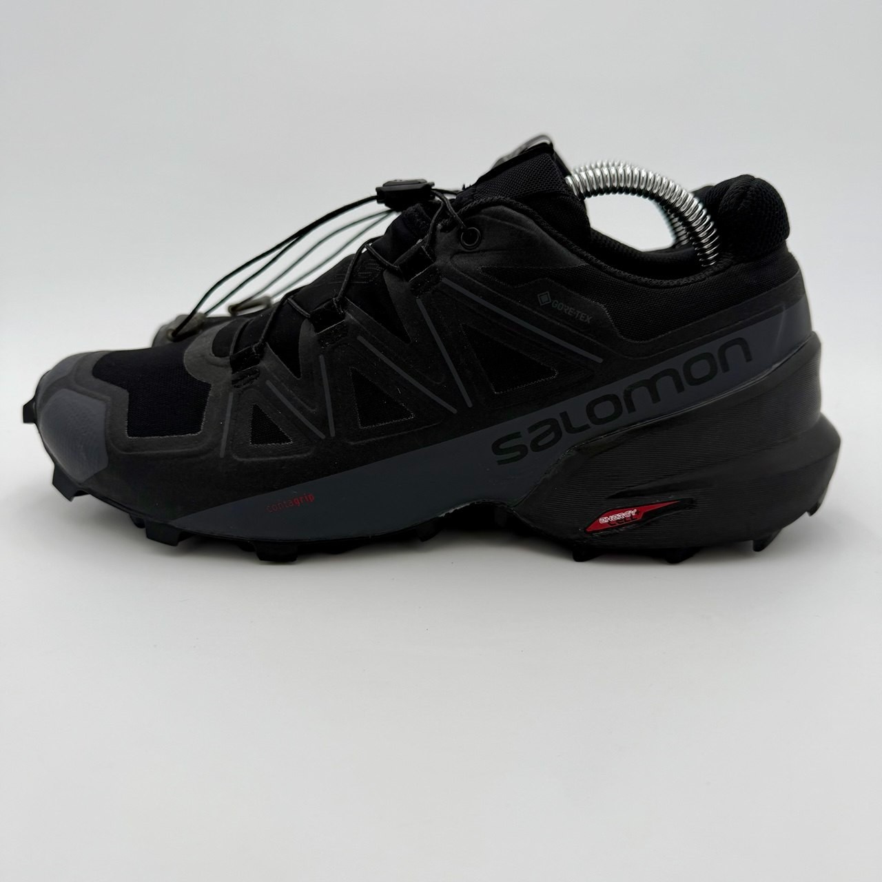 The Salomon Speedcross 5 GTX Trail Running Shoes in Men's Size 9 Black are designed for outdoor activities like hiking, running, and jogging. These waterproof sneakers feature Gore-TEX construction, a drawstring closure, rubber outsole, and lightweight synthetic upper material for comfort and performance. With a low-top design and standard shoe width, they are suitable for all seasons and can withstand various terrains. Perfect for those who enjoy nature and outdoor sports, these Salomon shoes offer a combination of style, functionality, and durability for active wear.
