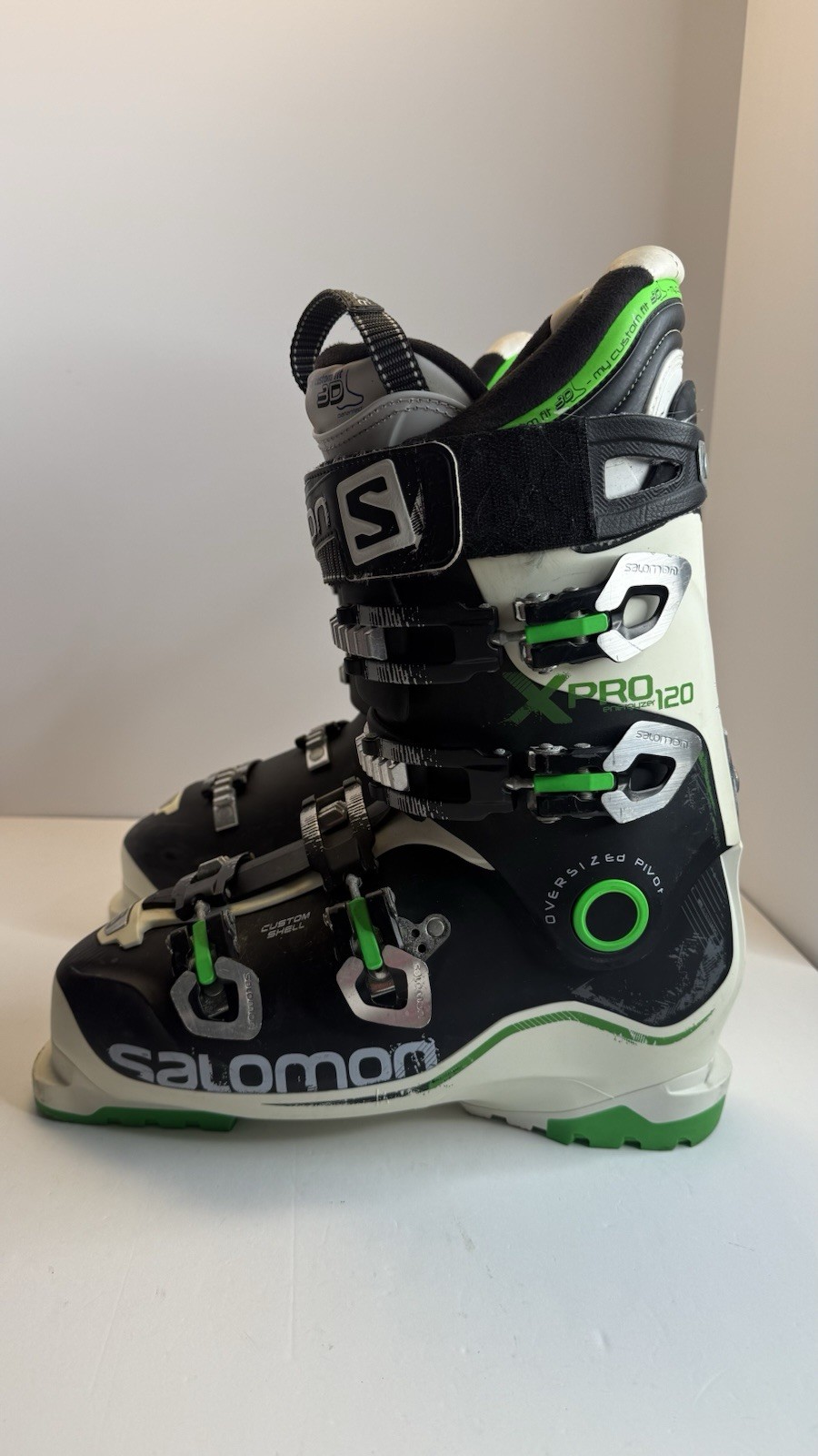 Salomon X Pro 120 Ski Boots — high-performance alpine boots for advanced skiers. Size 28.0 / 28.5 (326 mm boot sole length). Features My Custom Fit 3D Race liner, Custom Shell design for personalized fit, and Oversized Pivot for maximum power transfer. Condition: ✅ Good used condition — minor scuffs and cosmetic wear from normal use (see photos). ✅ Soles and buckles in great shape, all straps and clips fully functional. ✅ Clean interior, no odor. ✅ Flex 120 — responsive and stable performance. Made in Romania. Sold as is, ready for the slopes!