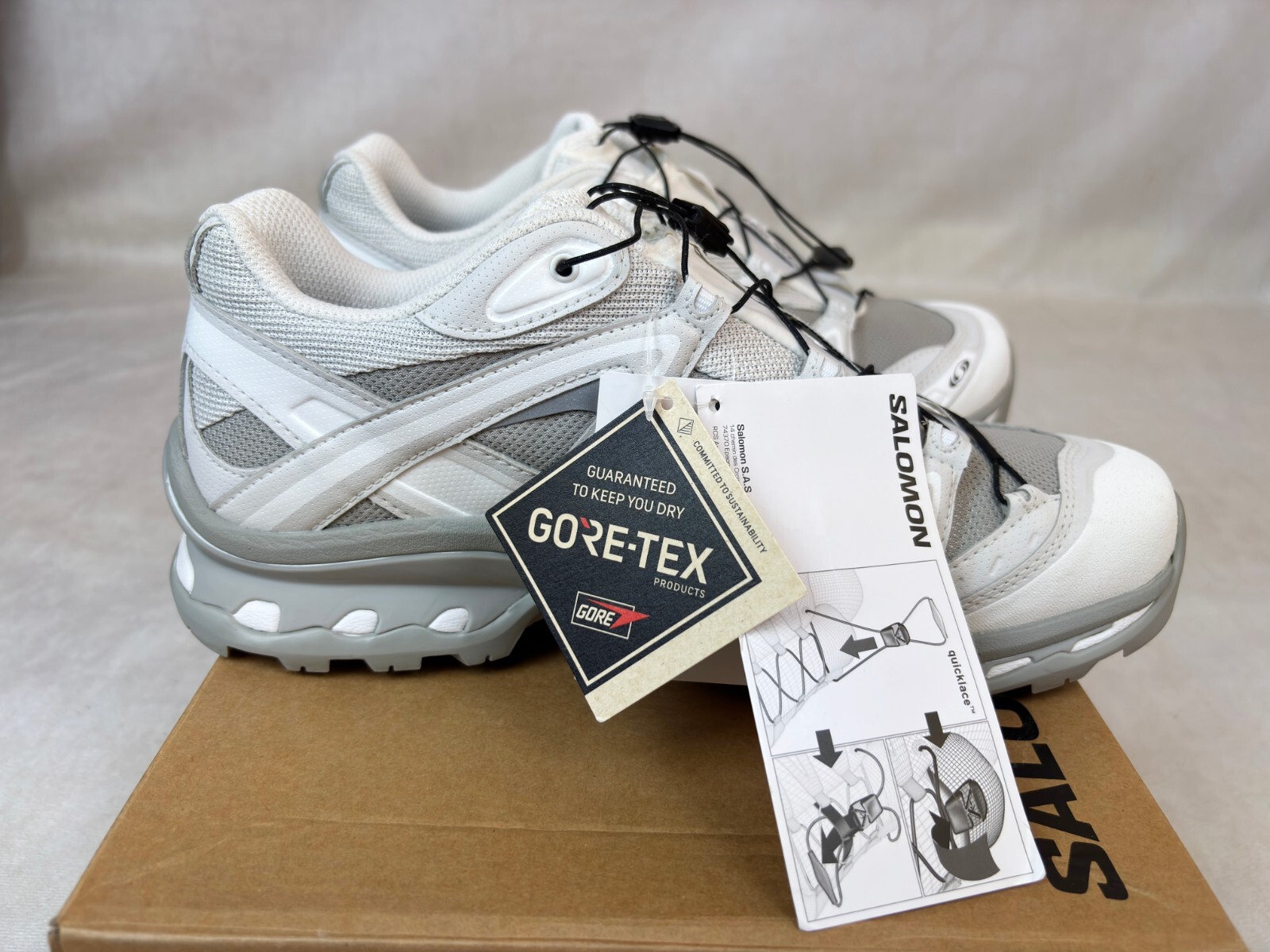 Salomon XT-QUEST Advanced GTX White / Light Grey Gore-Tex Waterproof This item is not open to offers. The item is listed on multiple platform. Please message me to confirm availability before buying. -- This is a Chinese market exclusive and retails in a few Asian countries. -- 100% Authenticity Garanteed. Support authenticity check. --Size US9.5 / UK9 / EU43 -- Brand New with tags.