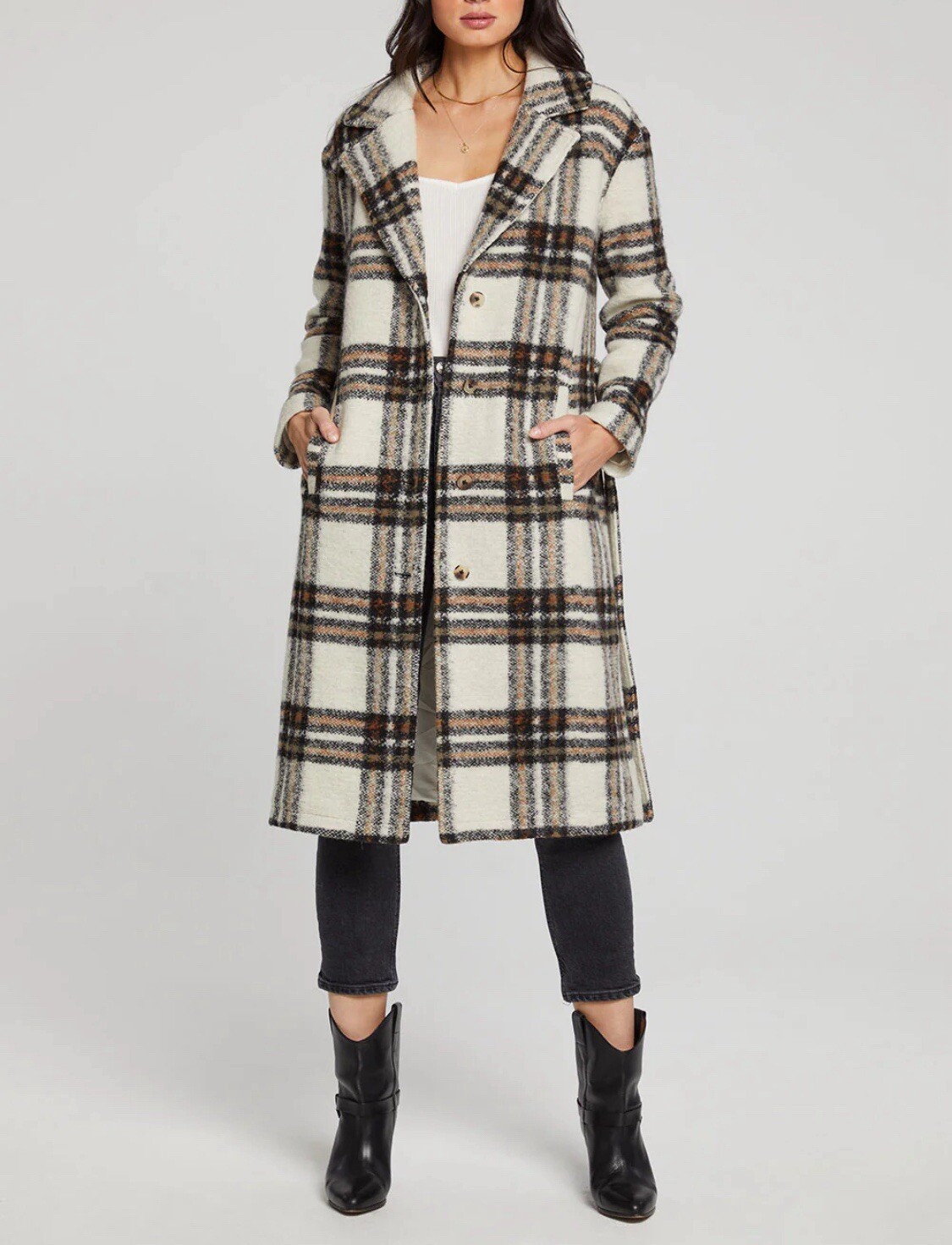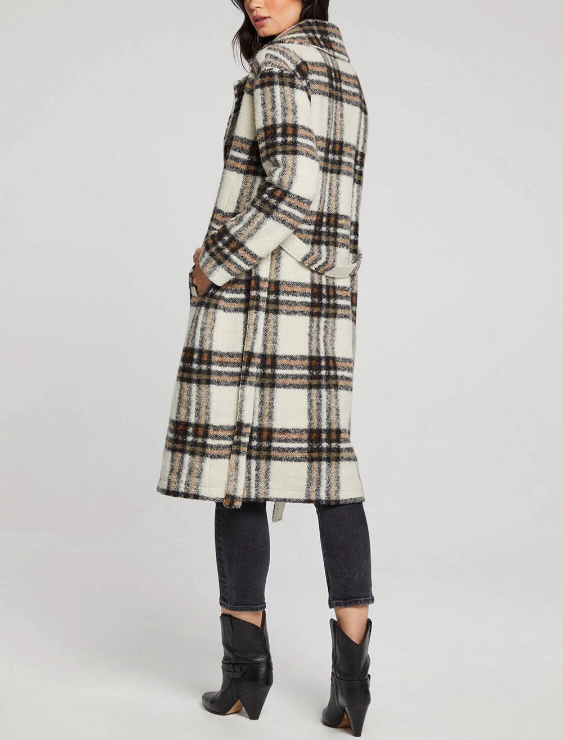 Our elegant and timeless Morgana Jacket ensures you'll look effortlessly sophisticated, with its long silhouette and waist-cinching tie. Combining it with any of our classic dresses is an instant sartorial upgrade; the classic plaid hues make it a wardrobe favorite, sure to be seen frequently throughout the season. 30% wool 70% polyester Model is 5'9" and wearing a size small