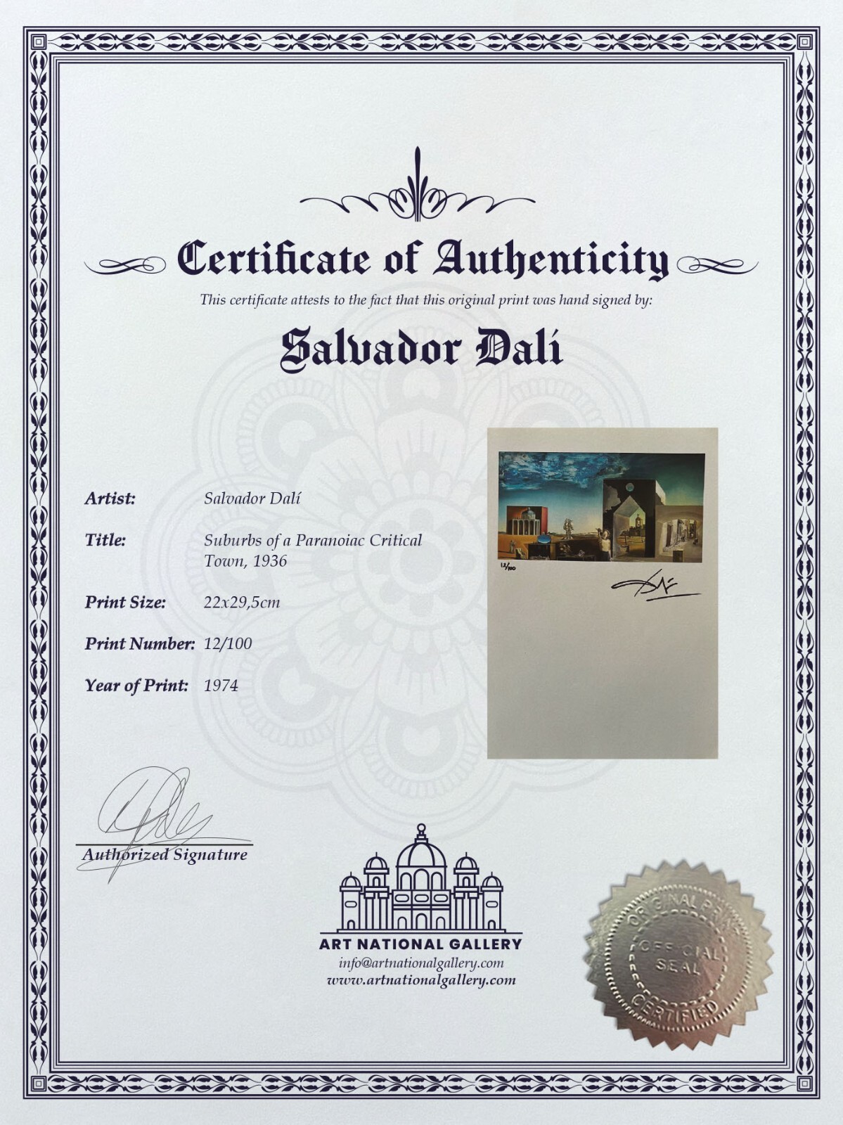 ARTPRECIATION GALLERY is and Art dealer located in the United States. We specialized in paintings, lithographs, and Original prints with certificates of authenticity (COA) originally from UK. Experience exciting auctions featuring works by artists such as Pablo Picasso, Salvador Dalí, Andy Warhol, Roy Lichtenstein, Henri Matisse, Joan Miró and many more. Art Finder Gallery gives you access to world-class art at prices you won't believe! One of eBay's most reputable sellers, consistently delivering outstanding customer service to all our customers. PURCHASE AND BID WITH CONFIDENCE! ORIGINAL ROY LICHTENSTEIN SIGNED LITHOGRAPH, COA AND APPRAISAL FOR $3,500 USD ARTIST: Salvador Dalí TITLE: Suburbs of a Paranoiac Critical Town, 1936 PRINT SIZE: 22x29,5 cm PRINT NUMBER: 12/100 YEAR OF PRINT: 1974 We only sell original art print. You can verify the originality with The Gallery in Europe by writing to them through their website and they will verify it immediately. FOR THE PURCHASE YOU WILL RECEIVE: Salvador Dalí Original Print Hand-Signed. Certificate of Authenticity by Art National Gallery. Certificate of Origin by Art National Gallery. Appraisal Certificate for 3,500 USD by Professional Art Appraisal. NO FRAME . 100% MONEY BACK GUARANTEED Discounts per volume available: if you buy 4 or more different items from our listings, we can negotiate a discount in the final invoice. Product Original Hand-Signed prints with COA (Certificate of Authenticity). Created in 1974. In great condition for the year printed. Originally from Europe. Shipping 100% money-back guaranteed. We ship Internationally to almost all countries. We accept domestic and international returns within 14 days of delivery*. Fast and secure shipping via USPS or eBay Global International. Contact Our team will be available to assist you Monday through Friday. We will answer all of your questions within 24 hours Frequently Asked Questions (FAQ) 1. WHAT IS A PRINT RUN NUMBER? Every print in a limited edition is numbered, usually in pencil or pen, at the bottom or top of the print. This number (that looks like a fraction) is called a print run number, and it shows the print's position in the edition. The denominator (the bottom number in the fraction) will show you how many prints were printed in one edition. The upper number (numerator) will show you when each print was created during the run. For example, if you see a 015/200 number on your piece, that means that you have the 15th print from the edition that contains a total of 200 prints 2. IS THE FRAME INCLUDED? NO, the frame is not included 3. DO YOU ACCEPT RETURNS? We do accept returns made within 14 days of delivery. The Item MUST: - Arrive back at our warehouses in good condition, as it will be inspected by our staff. - The return or exchange request is made within 30 days of delivery (NOT LATER THAN THAT). - sure you pack the lithograph very well, so it doesn't arrive damaged, and we can issue you a full refund back to your account. 4. ARE RETURNS OR EXCHANGES FREE?* Returns or exchanges within the U.S.A. are free. International returns or exchanges are NOT FREE. These are the responsibility of the buyer. No exceptions. 5. WHAT SHOULD I DO IF SOMETHING IS MISSING IN MY ORDER OR IS DAMAGED? If any of your purchased items are missing or are damaged, please contact us immediately to resolve the issue. We have a 30-day Money-Back Guarantee from the day the order was shipped. Please contact us within the time frame and we will be happy to assist you. 6. WHICH SHIPPING COURIER DO YOU USE? We mostly use USPS for orders in the U.S.A. and for international orders, we use eBay's shipping services. 7. WHEN WILL I RECEIVE MY ORDER? All orders are shipped out within the eBay processing and handling time guidelines and are shipped out by USPS or eBay International services. Please use the tracking number provided on your order detailed page for more information about your package. 8. THE TRACKING NUMBER SAYS DELIVERED, BUT I HAVEN'T RECEIVED MY ORDER? If the package shows on your order detailed page as delivered, you should get in direct contact with the courier company who delivered your package. They are now responsible for the delivery of the goods. 9. WHAT DO I DO IF SOMETHING IS MISSING OR DAMAGED IN MY ORDER? If any of your purchased items are missing or are damaged, please contact us immediately to resolve the issue. We have a 30-day Money-Back Guarantee from the day the order was shipped. Please contact us within that time frame and we will be happy to assist you. 10. "If for any reason you are not satisfied with the item please contact me directly before to leave a negative review also I offer free returns, thank you!!" Terms and Conditions Once a bid has been placed, it is a legally binding contract of purchase. Payment must be received within 24 hours of purchase. If payment is not received within 4 days of purchase then a Non-Paying Buyer Dispute will be filed, and 10 days later a final fee credit lodged. The number sold is based on availability. You will be notified on the day that your goods have been despatched via e-mail. Once you receive your goods, please inspect them for any damage during transit, and report the said damage within 24hrs via e-mail. If all is well, please leave feedback, so we are aware that you have received your goods. Please note that if there are any problems, contact us first via e-mail giving full details of any problem along with your. Sizing Details: Sizes are both in inches and centimeters. Sizes are always carried out with a margin of error. Therefore, sizes are as accurate as possible, but we do advise not to purchase a frame before the poster arrives to your destination. ARTPRECIATION GALLERY