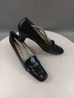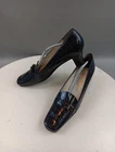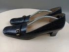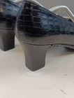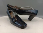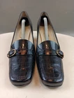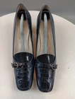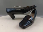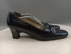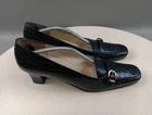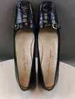 These Salvatore Ferragamo pumps are a stylish choice for women in size 8 with a narrow AAAA width. The shoes feature a striking black croc reptile print on leather, adding a touch of sophistication to any outfit. With a mid-height block heel, slip-on closure, and buckle detail, these pumps are perfect for both formal and casual occasions throughout the seasons. Perfect for those who appreciate animal print patterns and high-quality designer footwear.