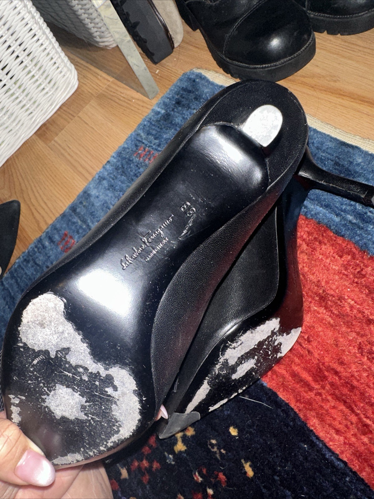 The Salvatore Ferragamo Women's Pumps in black and gold, size 8, are a stylish and sophisticated choice for business occasions. Made from high-quality leather, these slip-on heels feature a classic pump style with a block heel, making them comfortable and elegant. The combination of black and gold accents adds a touch of luxury to the overall look, perfect for the summer, fall, and spring seasons. With the renowned Ferragamo brand name, these pumps are a timeless addition to any woman's wardrobe.