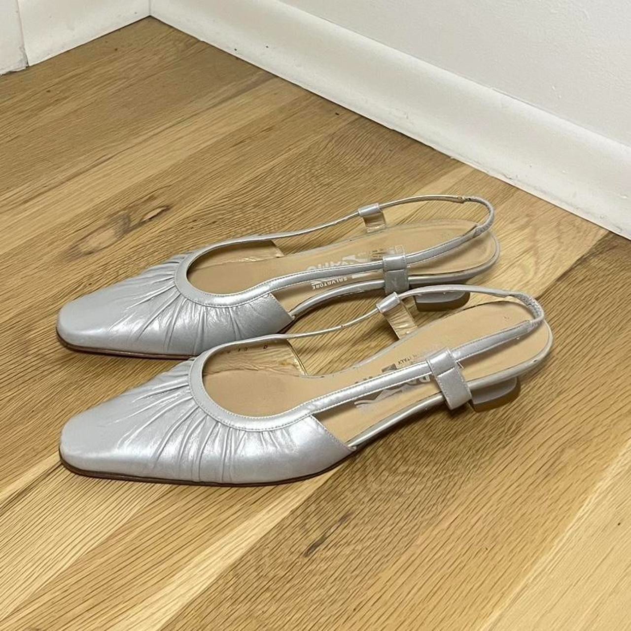 Size US 9.5 • Like new condition • Salvatore Ferragamo Vintage Salvatore Ferragamo Silver Slingback Flats - Holiday Y2K Minimal LuxeAuthentic Salvatore Ferragamo slingback flats. Soft silver leather with gathered toe detail. Chic soft pointed toe silhouette- Low heel = comfy + elegant- Made in Italy 🇮🇹- Great vintage condition with light wear- Perfect for Y2K, balletcore, quiet luxury, minimalist fits #ferragamo #vintageferragamo #slingbackheels #y2kstyle #balletcore