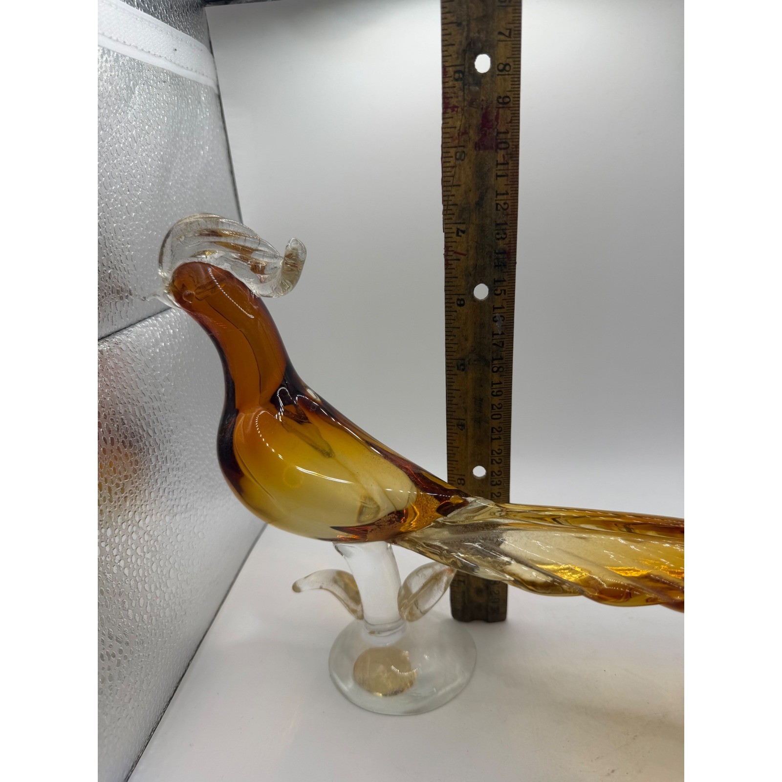 Salviati Murano glass pheasant figurine showcases the exquisite craftsmanship of Italian art glass. This mid-century modern piece features a striking amber and clear glass body with elegant gold aventurine flecks within the crest. The long, sweeping tail and graceful posture make it a standout decorative element for any shelf or mantel. Hand-blown in Italy, this bird sculpture captures the light beautifully through its translucent sommerso-style transitions. Measurements: • Height: 8.5" • Length: 12"