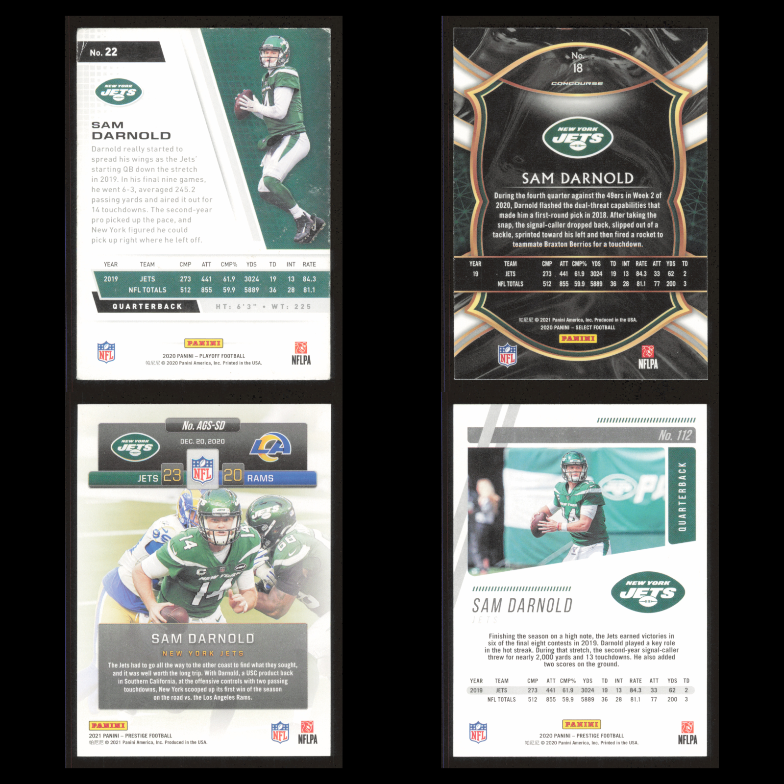 You will receive the exact cards in the scans. The scans are not stock photos—they are actual scans of the cards you will receive. Please send a message if you have any questions or read the full description. Sam Darnold Lot 4 Football Cards 2020 Panini Playoff New York Jets Set NFL NM You will receive the exact cards in the scans. The scans are not stock photos—they are actual scans of the cards you will receive. Please send a message if you have any questions. Overall these cards are in near-mint condition or better. Equivalent to cards fresh from the pack. Learn more about eBay's card condition guidelines here: https://pages.ebay.com/cardconditions/ Please view the scans and send a message if you have any questions about condition. List of Cards Included This list was generated by AI attempting to identify the cards from the scans and it may contain errors. For some types of cards/sets the AI can be very accurate and for others it can be very bad. If you were searching for a card on this list please confirm that it is in the lot by checking the images because the images are of the exact cards you will receive. If you have any questions, please send a message. 2020 Panini Playoff #22 Sam Darnold New York Jets Football Card 2020 Panini Select #18 Sam Darnold New York Jets Football Card 2021 Panini Prestige Any Given Sunday #AGS-SD Sam Darnold New York Jets Football Card 2020 Panini Prestige #112 Sam Darnold New York Jets Football Card
