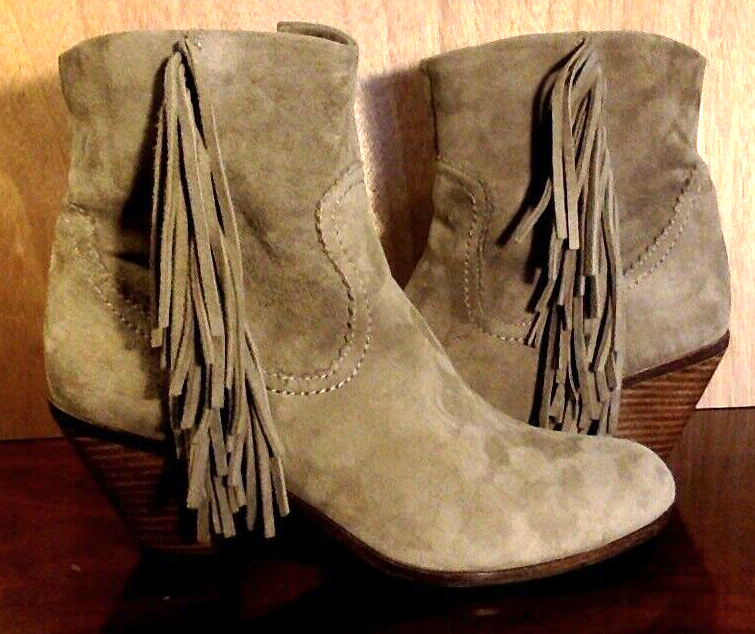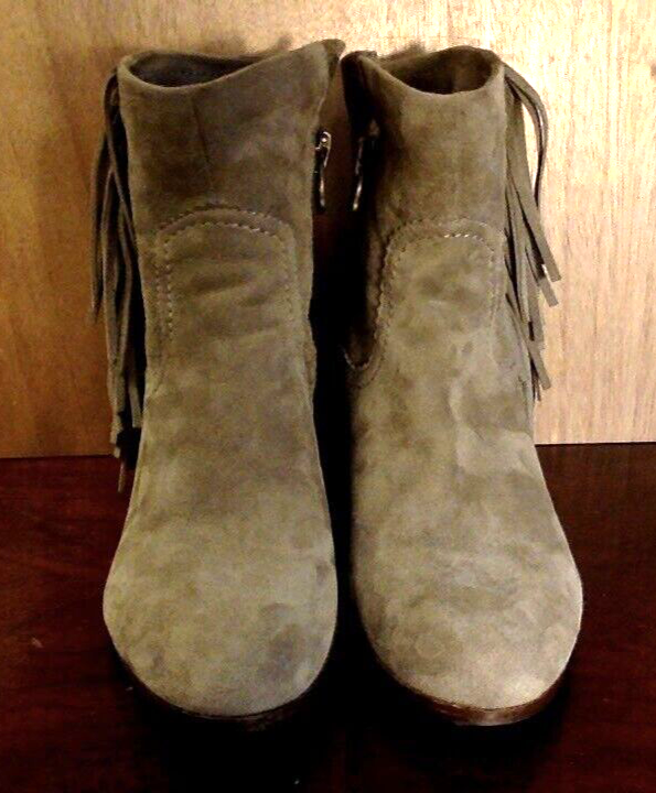 Taupe-grey size USA ladies 8. Very good lightly used condition, see photos. Pretty ankle boots, looks great worn with skirts or blue jeans for western or prairie styles. Ships via USPS priority mail, carefully boxed and insured. Thanks for looking, and enjoy!