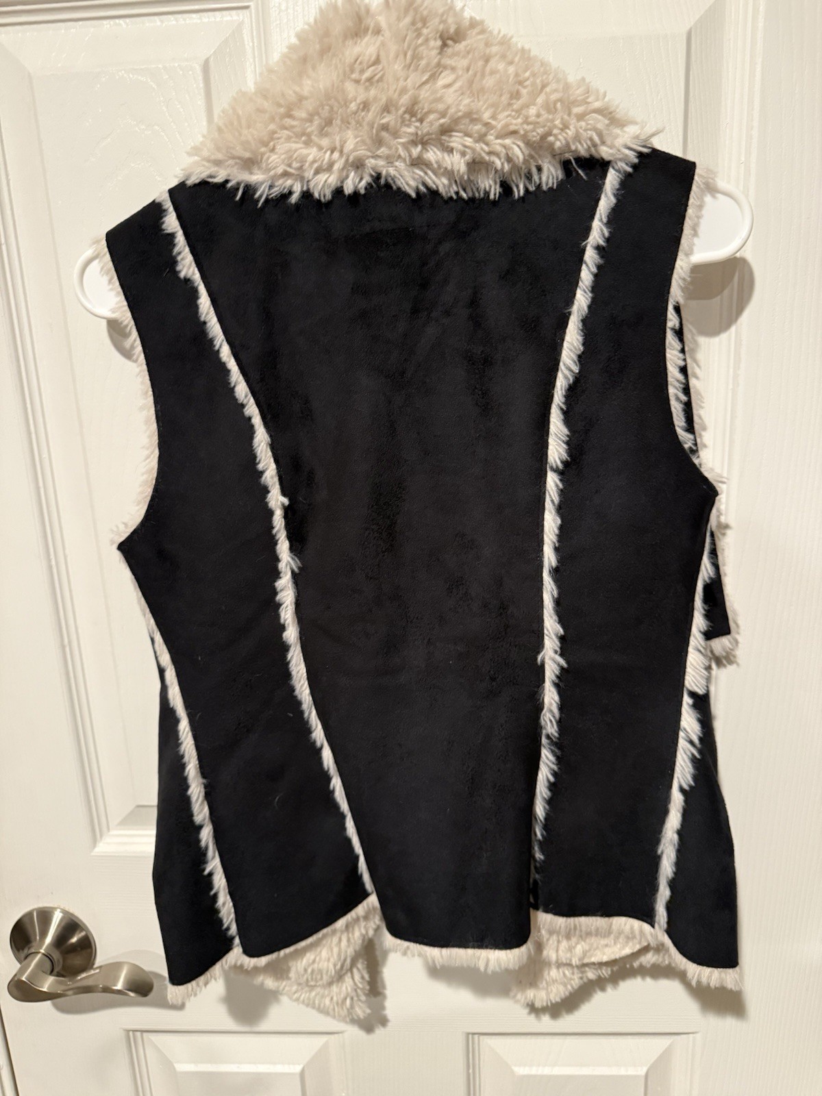 The Sam Edelman women's black and cream faux fur vest in size XS is a stylish and cozy addition to any winter wardrobe. Made with faux fur accents and a soft suede outer shell, this vest is designed to provide both warmth and sophistication. The cream color and jacket vest style make it versatile for various outfits, while the brand name ensures quality and fashion-forward design. Perfect for layering over any outfit, this vest is sure to become a go-to piece for the colder months. Excellent condition A7