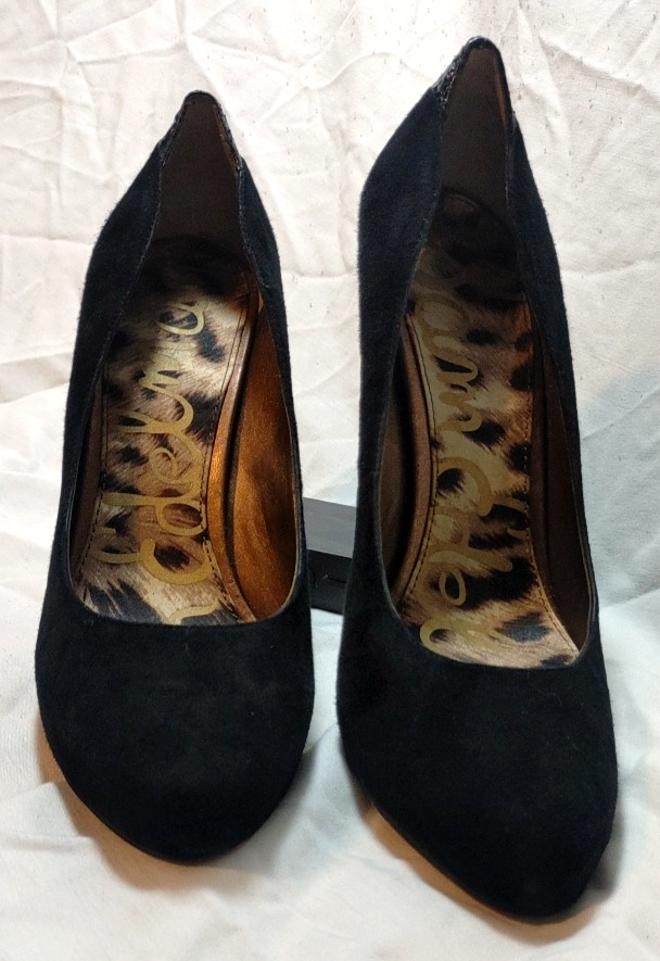 This item was previously used and is sold "As Is". See title and photographs for details and imperfections. Sam Edelman Yasmine Black Size 8.5 High Heel Stiletto Pumps - As Is Note: Faux snakeskin accent on upper wedge of heel areas. ***** Display Stand Not Included. *****