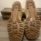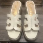 The product is a pair of Sam Edelman women's size 10 sandals in ivory leather. These strappy sandals feature a wedge heel and are perfect for various occasions such as travel, parties, casual outings, and formal events. The leather lining, upper, and outsole materials ensure durability and comfort, making them a stylish and versatile choice for any woman's shoe collection. Excellent condition with exception of one little mark on the S in the soul I don’t know how I did that