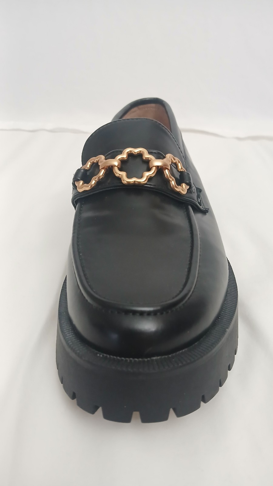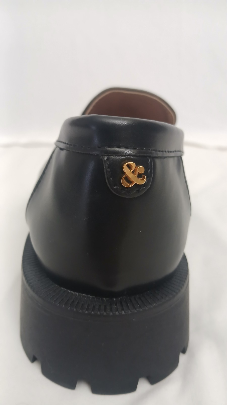 Brand: Sam & Libby Style: Lug Sole Loafers Color: Black Hardware: Gold-tone chain links Size: 8.5 (Women’s) Upper Material: Faux leather Outsole: Chunky rubber lug sole Closure: Slip-on Condition: (Fill in: “New without box,” “Pre-owned, excellent condition,” etc.) These Sam & Libby black lug-sole loafers feature a bold, modern silhouette with a thick platform rubber sole designed for comfort and stability. The gold chain hardware across the vamp adds a stylish statement, pairing well with both casual and dress-casual outfits. The slip-on construction and cushioned insole make them easy and comfortable for all-day wear. Perfect for elevating jeans, trousers, or skirts with a polished yet contemporary look.