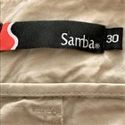 Elevate your wardrobe with these versatile Samba pants. Made with a comfortable cotton-spandex blend and featuring a low-rise fit, these pants are perfect for any casual or work outfit. The pants come with five pockets, providing ample space to store your essentials. The solid beige color and flat front design create a classic look that is perfect for any occasion. The pants are accented with studded, embroidered, button, and zipper details, adding a touch of style to your outfit. These pants are easy to care for, lightweight, and offer shaping and stretch for maximum comfort. Very good preowned Condition 97% cotton 3% spandex Thin stretch fabric machine washable 32’ around low waist 43’ around hips 8.25’ front rise 33’ leg inseam 17’ around bottom of leg 3’ long belt loops nice for casual wear