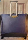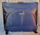 Samsonite X'ion Carry-On Spinner Garment/Suit Luggage -Royal Blue/Slate. 23"x21"x10.25" PLEASE NOTE WHEELS ARE DAMAGED AND PRODUCT ROLLS UNEVENLY. The wheels can be replaced, but I don't want to deal with tracking down replacement parts and then doing all the work. The body is in EXCELLENT condition however. A convenient garment carrier, with easy-to-maneuver wheels. This garment has a unique packing feature. The inside opens like a book providing an open packing space. The large front zippered pocket adds additional storage. And the inside bottom compartment can house shoes, toiletries any extra packing items. On the Outside, this case is constructed of lightweight Nylon/Poly blend material with heavy-duty large zipper pulls and comfort handles. The multi-directional four-spinner wheels provide an easy push-or-pull method. All these features are found throughout the Samsonite X'ion collection. Inside, this piece has room for hanging clothes as well as folded items, shoes, toiletries and passports. There is one zippered pocket on the outside for additional packing Comes with samsonite lock and carrying strap.