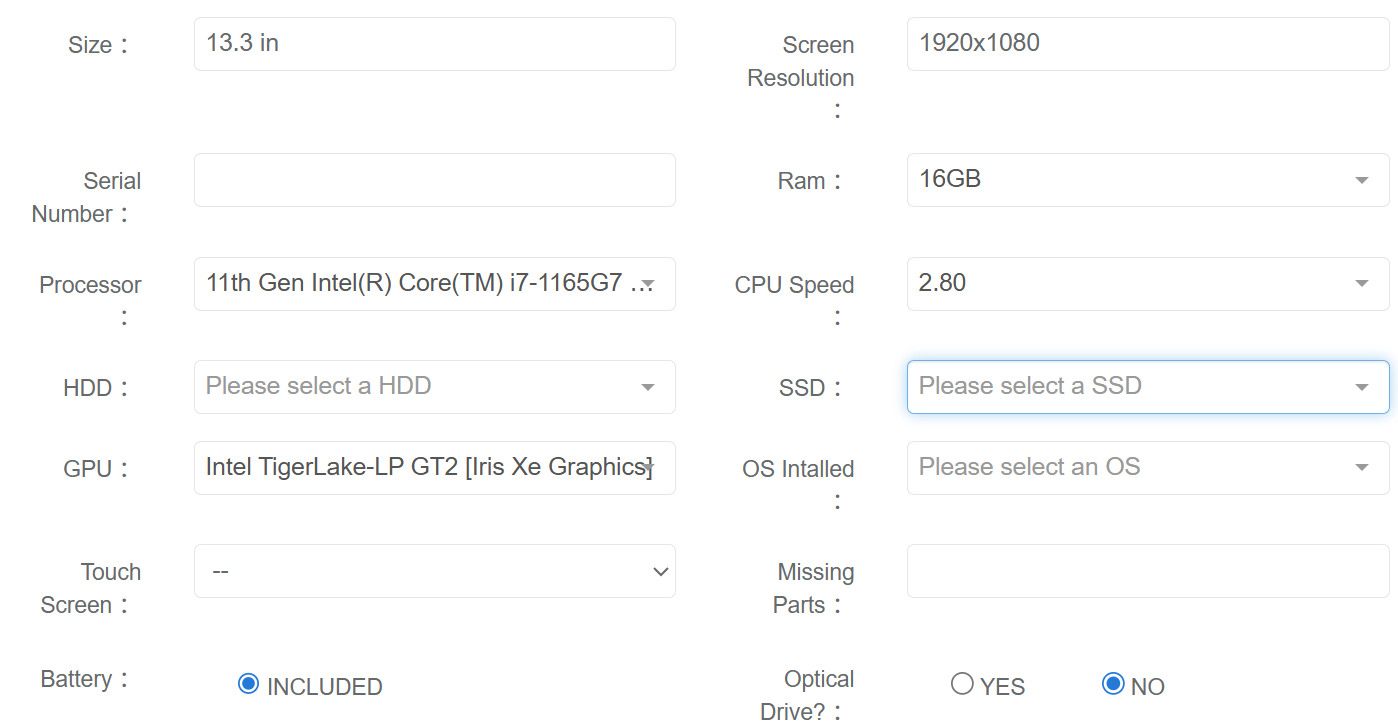 Samsung Galaxy Book Pro 13" Functionality: Fully Functional but needs SSD Condition Rating: GRADE B Battery Health: 90% Drive Health: No Drive Installed Minor Scratches and Wear (as seen in photos) Small Dents (as seen in photos) Specs Processor: Intel Core i7-1165G7 2.8GHz OS: No OS RAM: 16GB GPU: Iris XE Graphics Storage: No SSD Screen Size: 13.3" Included Laptop Not Included Charger Original Box