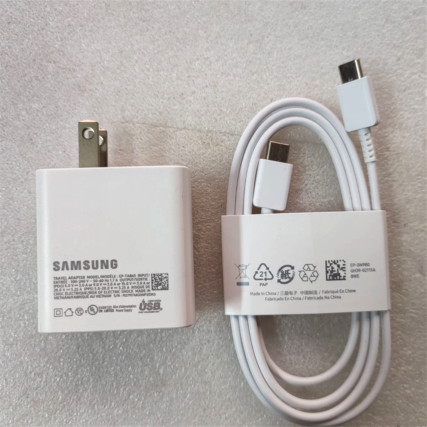Genuine 65W EP-TA865 SAMSUNG Galaxy Book4 Pro 360 Fast Charging Power Adapter INPUT: 100-240V 50-60Hz (for worldwide use) OUTPUT: (PDO) 5.0V 3.0A or 9.0V 3.0A or 15.0V 3.0A or 20.0V 3.25A (PPS) 5.0V-20.0V 3.25A Connecter size: USB Type-C Outlet: 2-prong Warranty:12 months Status: Brand new original Package includes: 1 X AC Adapter 1 X USB Type-C to USB Type-C Cable (5A/20V/100W 1.8m)