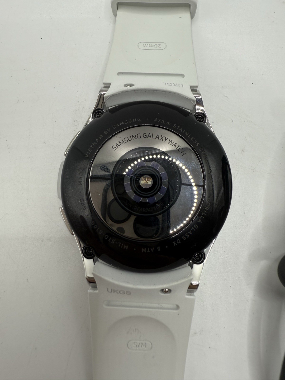 Used In great condition comes with watch band and charger The Samsung Galaxy Watch4 Classic 42mm Stainless Steel SM-R880 in Silver is a high-quality smartwatch designed by Samsung. It features a sleek silver stainless steel case with a comfortable white ridges-sport band made of durable fluoroelastomer material. The watch is water-resistant, has an AMOLED display, and is Wi-Fi capable, making it a versatile and stylish accessory for Android users. With Bluetooth connectivity, this smartwatch offers a range of features to enhance your daily life.