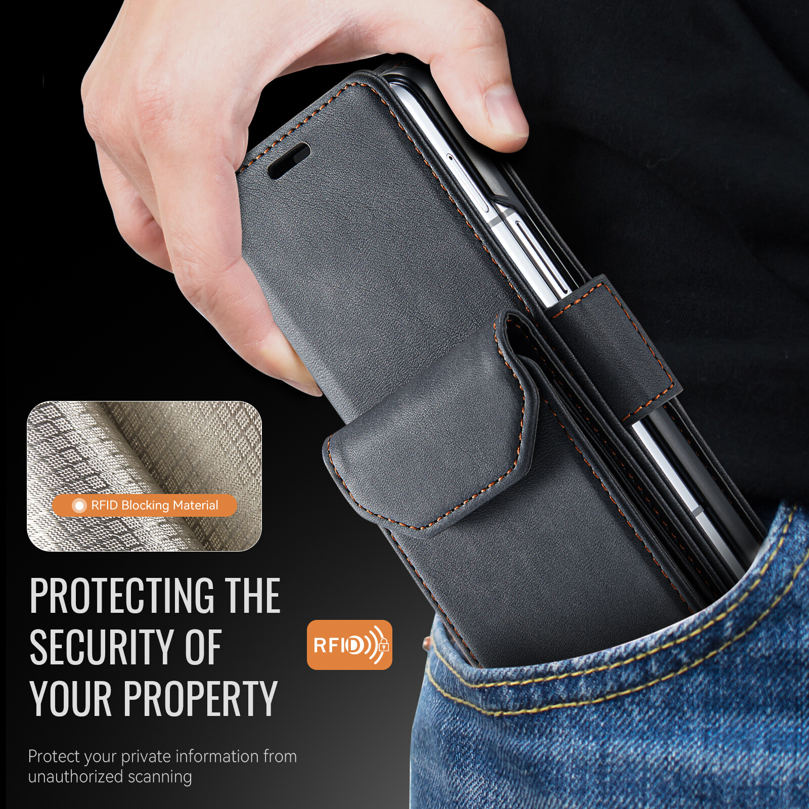 For Samsung Galaxy Z Fold 6 5 RFID Blocking Leather Wallet Case with Card Slots Key Features: Multi-Functional Wallet Case – Features 3 card slots, 1 cash slot, and an additional card pocket for convenience and organization. Premium Leather Design – Crafted from high-quality leather for a classic, sophisticated look with 360° drop protection. Adjustable Kickstand – Supports multiple viewing angles, allowing for hands-free video calls and streaming. RFID Blocking Security – Integrated RFID blocking material protects your credit card information from unauthorized scanning. Strong Magnetic Closure – Secure snap-on magnetic buckle ensures your phone and valuables stay safe on the go.