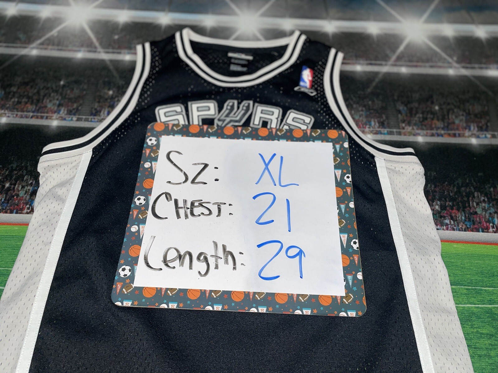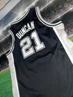 Show your love for the San Antonio Spurs and basketball legend Tim Duncan with this preowned Adidas jersey. The black XL jersey features Duncan's number 21 and is perfect for young fans. The jersey is made for boys and is a size 18/20. It is perfect for game day or for adding to your collection of sports memorabilia. The jersey is in great shape and ready for wear. Get your hands on this must-have piece of fan apparel today!